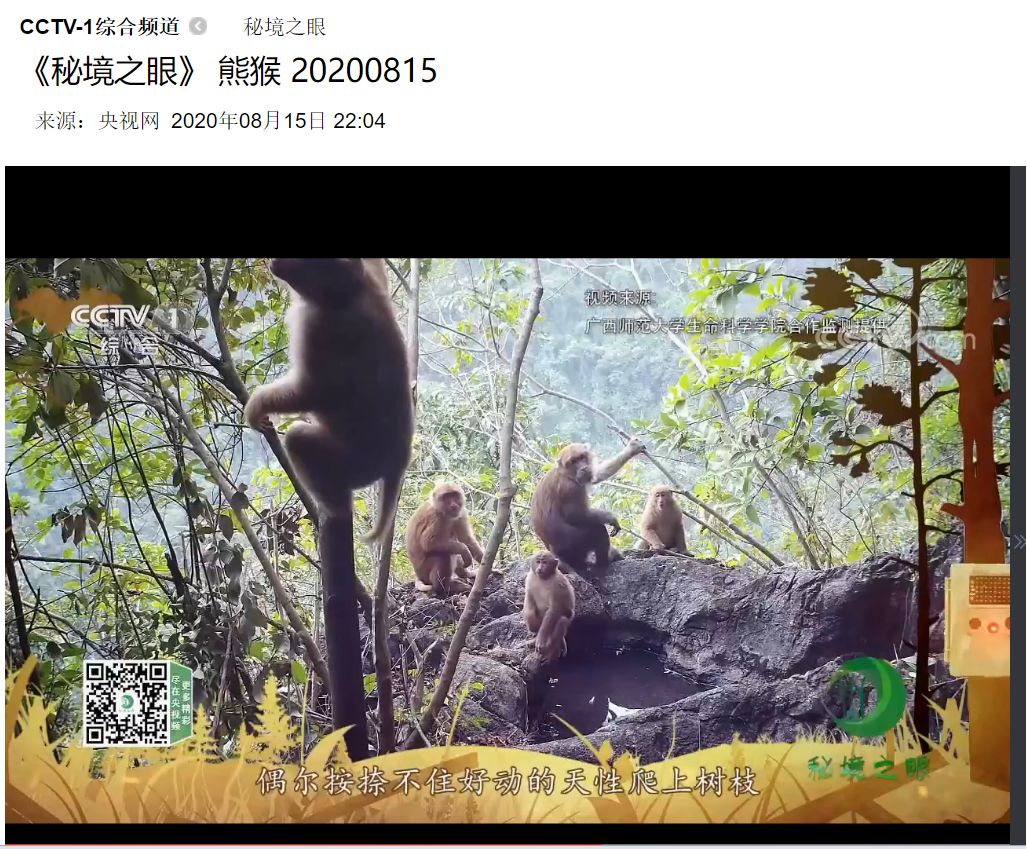 2020年7月31日和8月15日,中央电视1台综合频道《秘境之眼》播放了广西恩城国家级自然保护区通过红外相机拍摄到野生熊猴和斑头鸺鹠活动的视频,这是我校生命科学学院周岐海教授与广西恩城国家级自然保护区合作开展红外相机长期监测的成果之一。广西恩城国家级自然保护区是我校生命科学学院重要的野外科研实习基地,长期合作开展石山灵长类和动物多样性研究。从2019年开始,周岐海教授与保护区合作,开始布设红外相机开展野生兽类和鸟类多样性长期监测。目前,已监测记录18种兽类和36种鸟类,包括黑叶猴和熊猴2种国家Ⅰ级重点保护野生动物以及猕猴、斑林狸、凤头鹰、白鹇、原鸡等11种国家Ⅱ级重点保护野生动物。除广西恩城国家级保护区外,周岐海教授的研究团队还与广西崇左白头叶猴国家级自然保护区、广西弄岗国家级自然保护区、广西大明山国家级自然保护区、广西猫儿山国家级自然保护区和广西花坪国家级自然保护区合作开展红外相机对野生动物多样性监测。