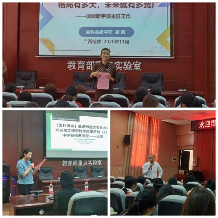 讲座分别邀请到桂林市首都师范大学附属实验中学校长易振仁,广州白云广附实验学校副校长、四会市广附实验学校党支部书记、常务副校长王娜,南宁第十四中学副校长雷健红,百色高级中学党政办副主任、生物教研组长、班主任凌鹤,为生命科学学院师生分享教学经验及工作感悟。讲座采用线上线下相结合的方式进行,累计参与人数达2000余人次。学院党委主要负责人、学生工作主要负责人及部分专任教师出席本次活动。
