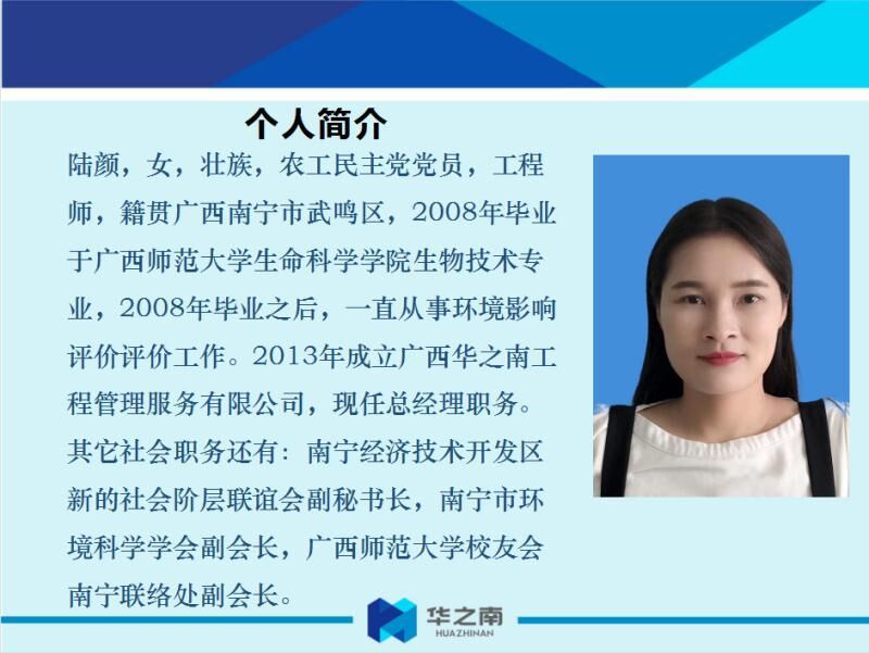 陆颜,女,壮族,农工民主党党员,工程师,籍贯广西南宁市武鸣区,2008年毕业于广西师范大学生命科学学院生物技术专 业,2008年毕业之后,一直从事环境影响评价评价工作。2013年成立广西华之南工程管理服务有限公司,现任总经理职务。社会职务:南宁经济技术开发区新的社会阶层联谊会副秘书长,南宁市环境科学学会副会长,广西师范大学校友会南宁联络处副会长。