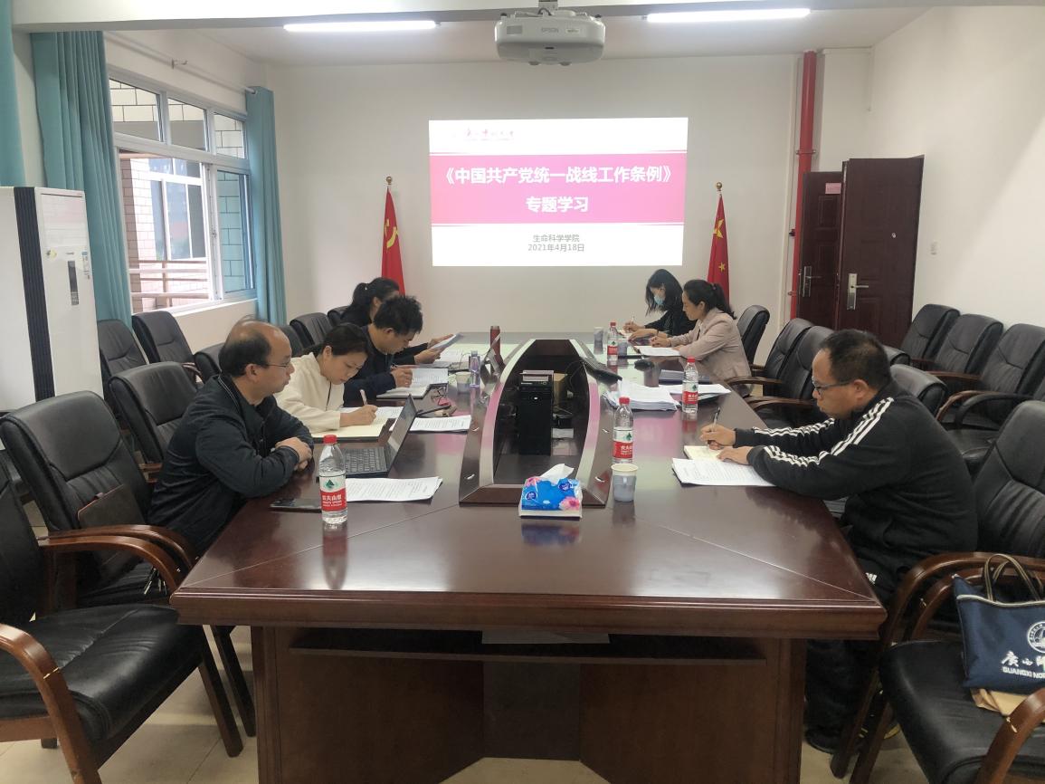 为深入贯彻习近平总书记关于加强和改进统一战线工作的重要思想,进一步增强统一战线工作实效。4月18日上午,生命科学学院在理科组团二楼会议室召开党委会专题学习《中国共产党统一战线工作条例》。学院党委书记孙涛领学,学院党委委员、党政班子成员参加学习。