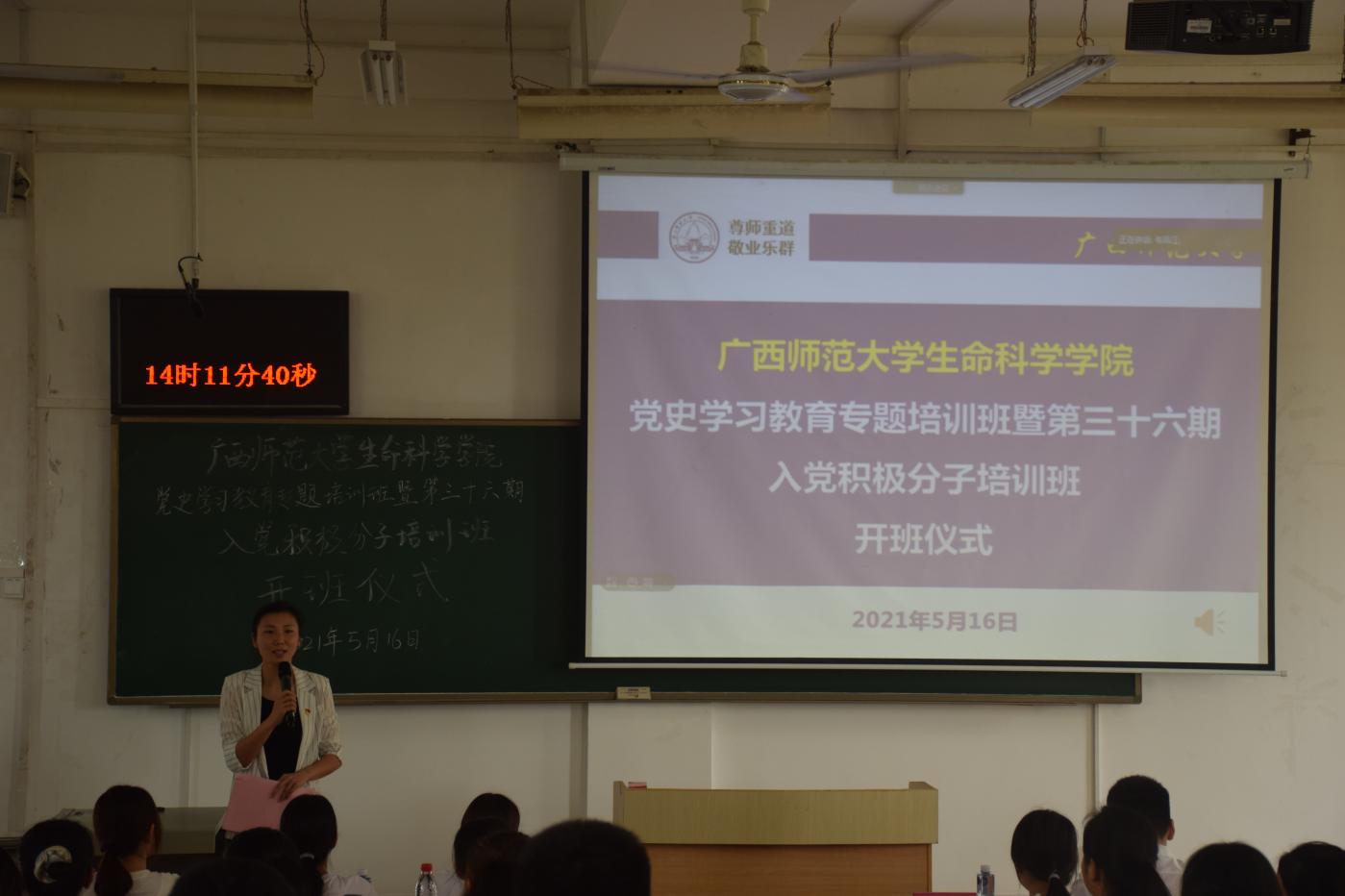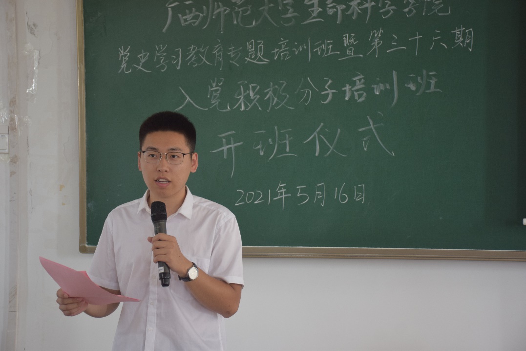 为进一步加强对入党积极分子的培训教育,提高入党积极分子的思想政治素质,扎实推进党史学习教育,2021年5月16日下午2时,生命科学学院在文科综合楼四区203教室举办党史学习教育专题培训班暨第三十六期入党积极分子培训班开班典礼。生命科学学院党委书记孙涛、第三十六期入党积极分子以及发展对象共同参加本次活动,活动由培训班班主任主持。