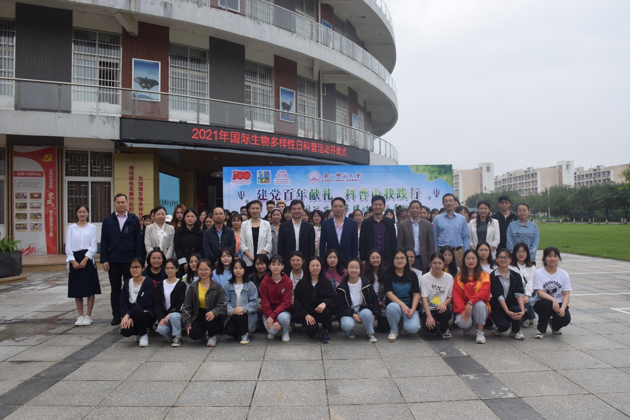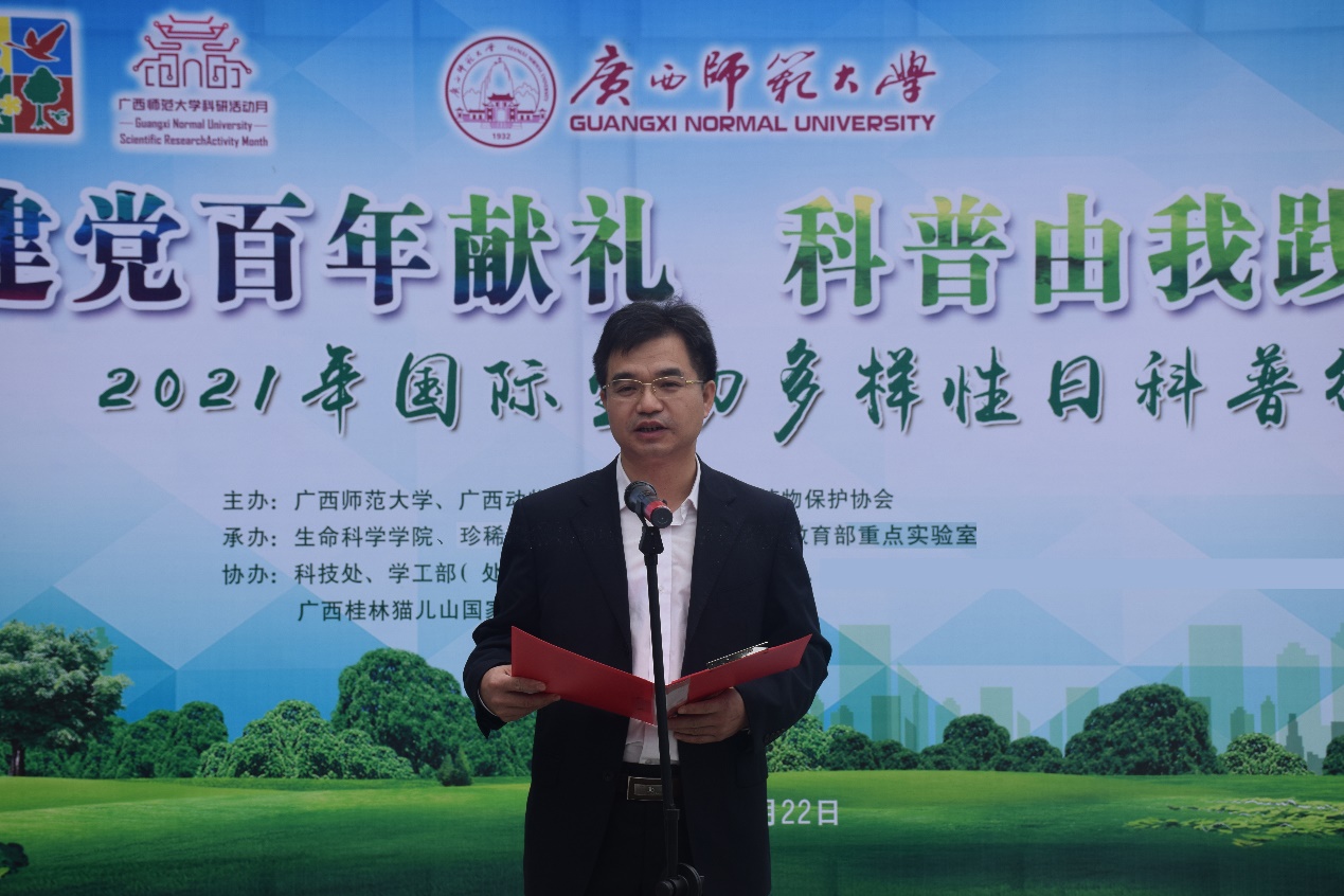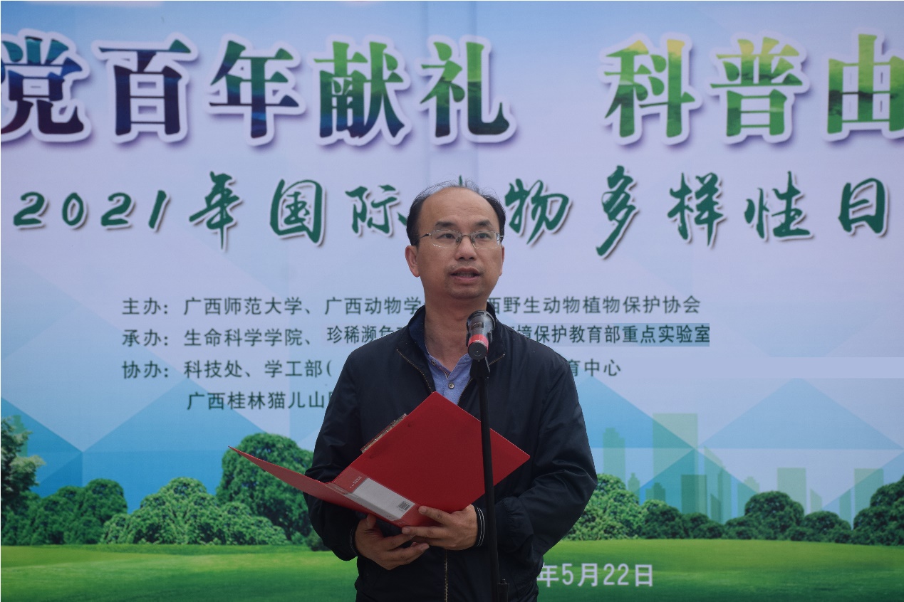 值此“国际生物多样性日”来临之际,为使师生更加深入了解生物多样性相关知识,明确习近平总书记所提出的“一定要呵护好桂林的山水”发展要求,牢固树立“保护生物多样性,从自己做起,从现在做起”的生态意识,生命科学学院联合科技处、学工部(处)、大学生心理健康教育中心、珍稀濒危动植物生态与环境保护教育部重点实验室等部门,于2021年5月22日在广西师范大学雁山校区成功举办“国际生物多样性日科普行”系列活动。中国科学院动物研究所代表、中国动物学会两栖爬行动物学分会理事成员代表及生命科学学院党政班子,线上线下师生和社会公众近2000人参与了本次活动。