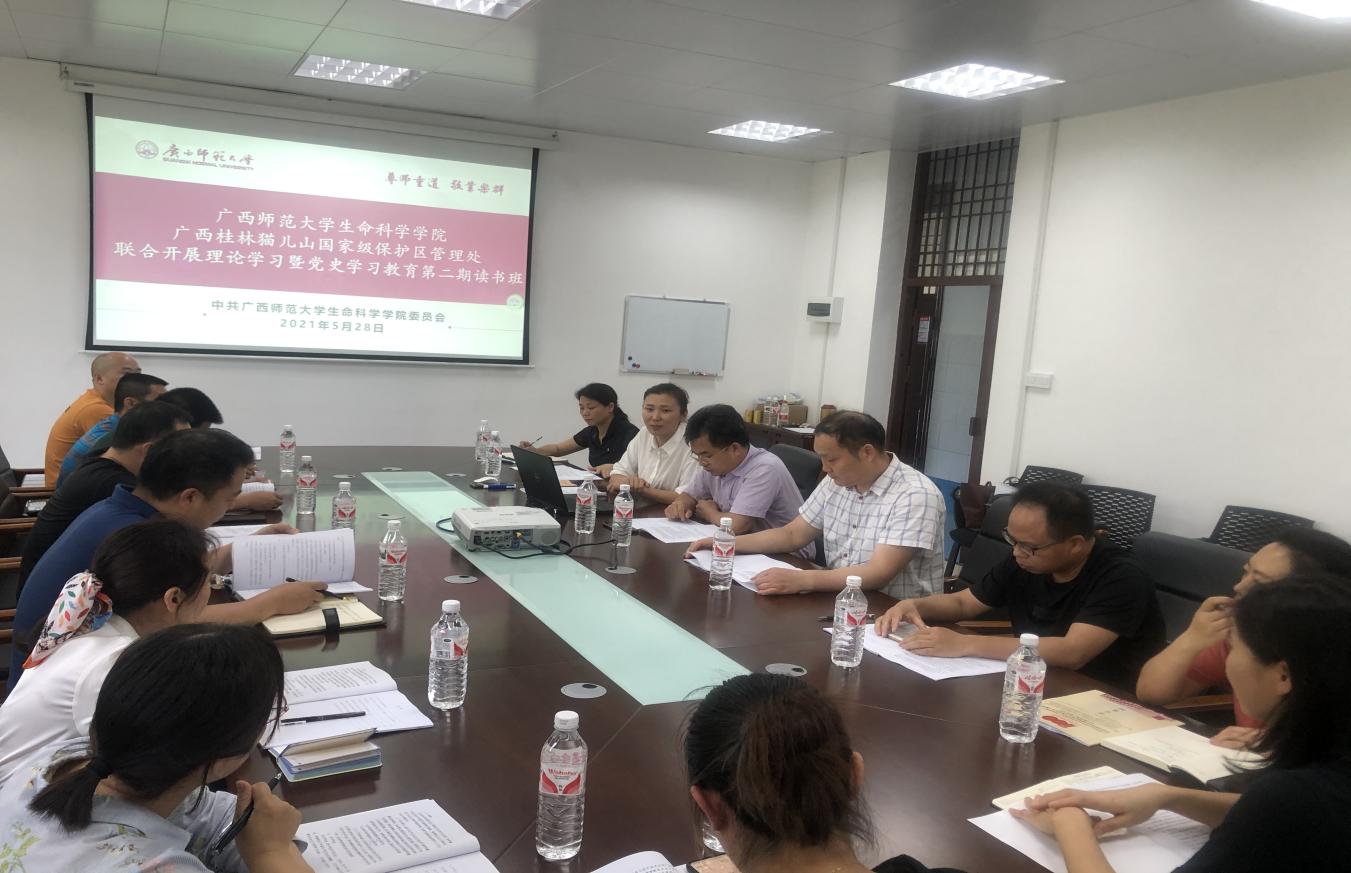 为贯彻落实习近平总书记视察广西讲话精神,共谋加快推动漓江流域生物多样性保护工作发展新思路,凝心聚力推进珍稀濒危动植物生态与环境保护教育部重点实验室评估工作。5月28日下午,生命科学学院与广西猫儿山保护区管理处在育才校区国重室2号楼304会议室联合开展了以“共学党史悟思想,共建自然保护壁垒”为主题的理论学习暨党史学习教育第二期读书班,会议由生命科学学院党委书记孙涛主持。