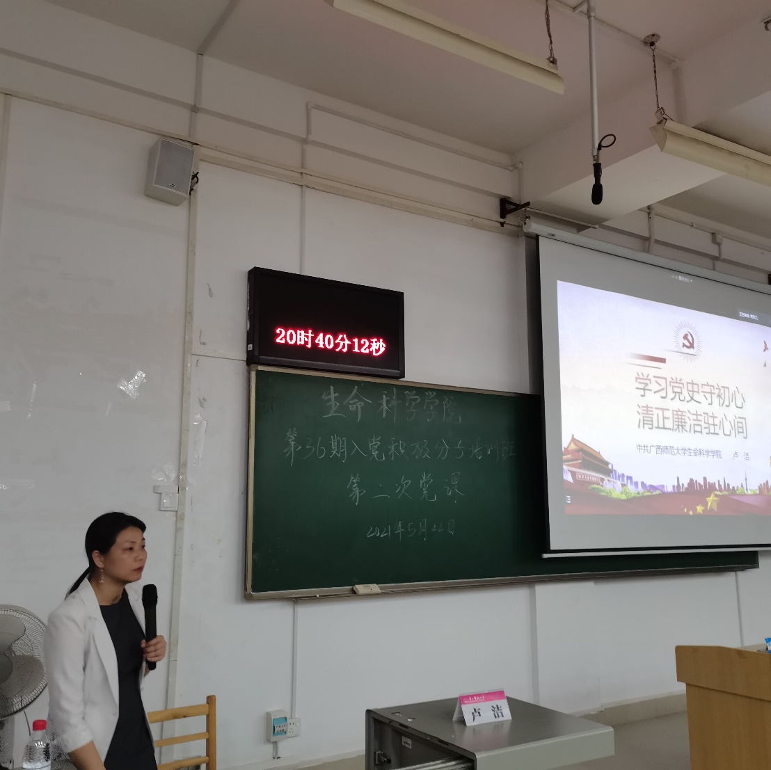 【第二讲】2021年5月22日19:10,广西师范大学生命科学学院党委副书记卢洁带领大家学习第二讲《中国共产党的最终目标与现阶段任务》。卢洁老师首先带领全体同学为袁隆平院士默哀。随后卢洁老师为同学们讲述了新民主主义革命时期的历史、共产主义社会的根本性质。中国共产党的最高理想是实现共产主义,共产主义社会是最理想、最美好的社会。她讲到:清正廉洁是中国共产党担当使命的必要条件,中国共产党所肩负的伟大任务和光荣使命,决定了党的组织和党员干部必须做到清正廉洁。大学生应做到清正廉洁,学史明理,培养清廉意识;学史崇德,汲取清廉力量;学史力行,争做清廉表率。