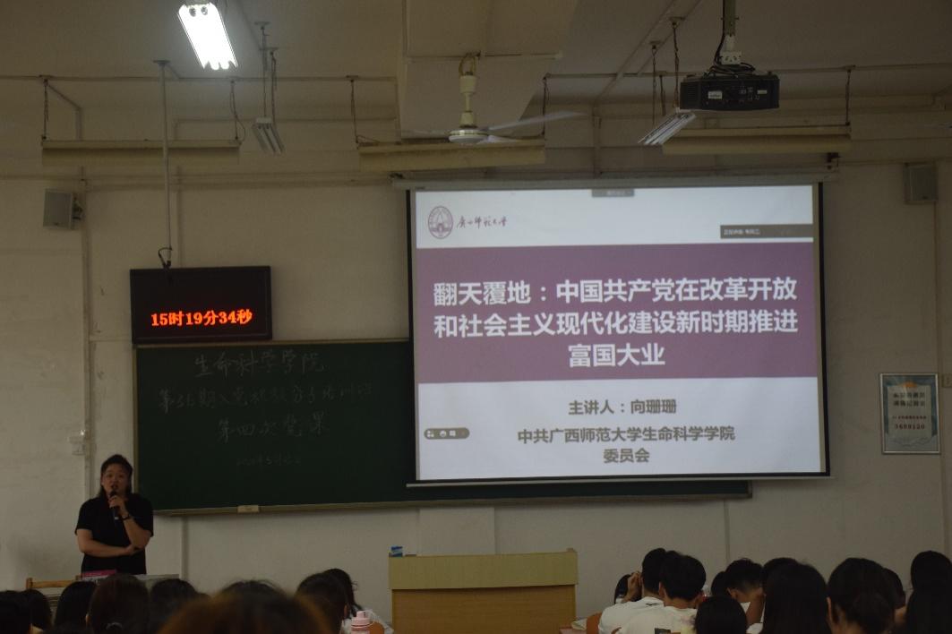 【第一讲】2021年5月16日15:00,广西师范大学生命科学学院党委书记孙涛为大家讲授《中国共产党的组织、制度、纪律与优良作风》。孙涛老师以“天问一号”火星探测为切入点,结合视频与具体案例对中国共产党为什么能、马克思主义为什么行,中国特色社会主义为什么好进行了生动的讲解。她指出,2021年是中国共产党成立100周年,也是“十四五”开局之年,站在“两个一百年”奋斗目标的历史交汇点上,作为党组织的后备力量,大家既要充满信心,也要居安思危。要胸怀中华民族伟大复兴战略全局和世界百年未有之大变局勇于担当作为,增强斗争精神,认真完成学生的本职工作,以优异成绩庆祝中国共产党成立100周年。