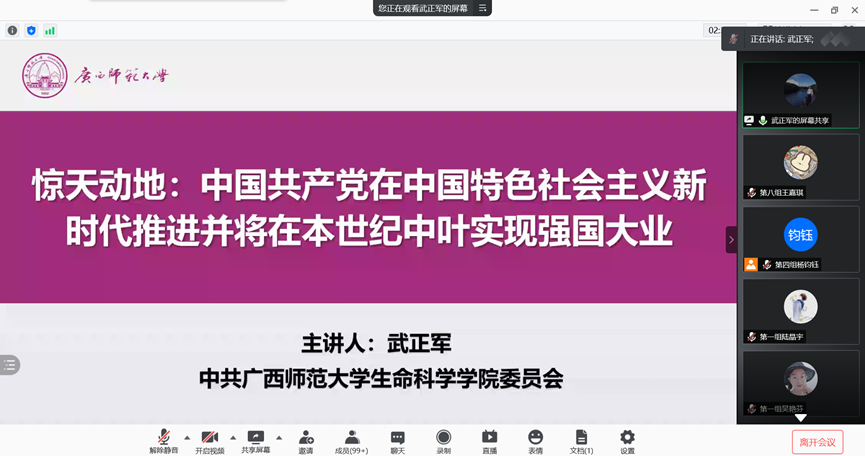 【第五讲】2021年5月23日16:00,广西师范大学生命科学学院主院长武正军带领大家学习第五讲《中国共产党的性质、宗旨和指导思想》。武正军老师详细的为同学们讲述中国共产党的百年光辉历史。他指出:同学们要明确青年应坚定理想信念,牢记初心使命,树立终身学习的观念,坚持学习先进理论,先进思想,党纪法规,原原本本学,认真刻苦学,学深悟透、融会贯通,做到学、思、用贯通,知、信、行统一。