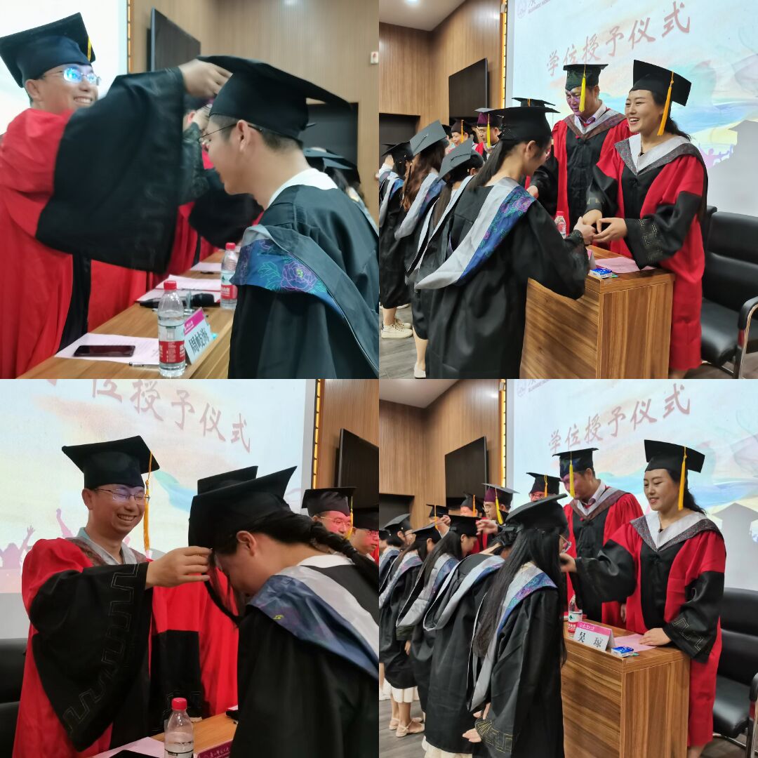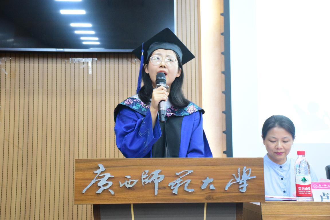 在学院的学位授予仪式环节,学位委员会委员着导师服,亲自为2021届毕业生进行拨穗正冠仪式,将学位帽帽檐上的流苏由右边拨到左边,以授予学位。拨穗仪式代表着稻穗与麦穗的成熟,象征着毕业生已经学有所成,可以展翅高飞,这是老师们对毕业生学业水平的肯定,更是对他们美好未来的祝福。最后,全体合唱广西师范大学校歌《育才之歌》,在欢乐的氛围中,同学们争相与老师合影留念,2021届毕业典礼圆满结束。