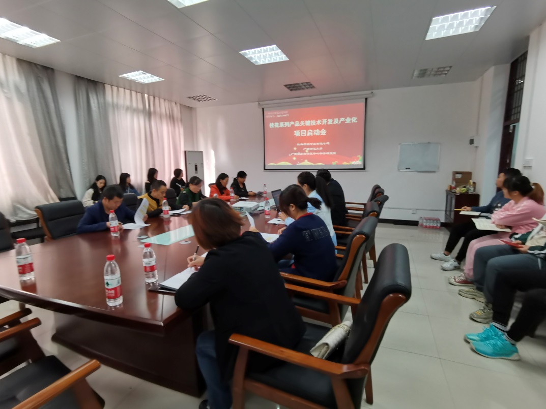 10月28日上午,由桂林顺昌食品有限公司牵头发起,广西师范大学、广西壮族自治区茶叶科学研究所参与的广西重点研发计划项目“桂花系列产品关键技术开发及产业化”项目启动会暨实施方案论证会在我校国家重点实验室2号楼三楼生物医学研究中心会议室304召开。本次会议邀请了桂林顺昌食品有限公司行政部张晓娟经理、品质管理部李华桂经理、技术部黄文秀经理等;广西壮族自治区茶叶科学研究韦柳花高级农艺师;广西师范大学陈伍香教授、吴琼副院长、徐世三博士等多名专家组成员列席启动工作。