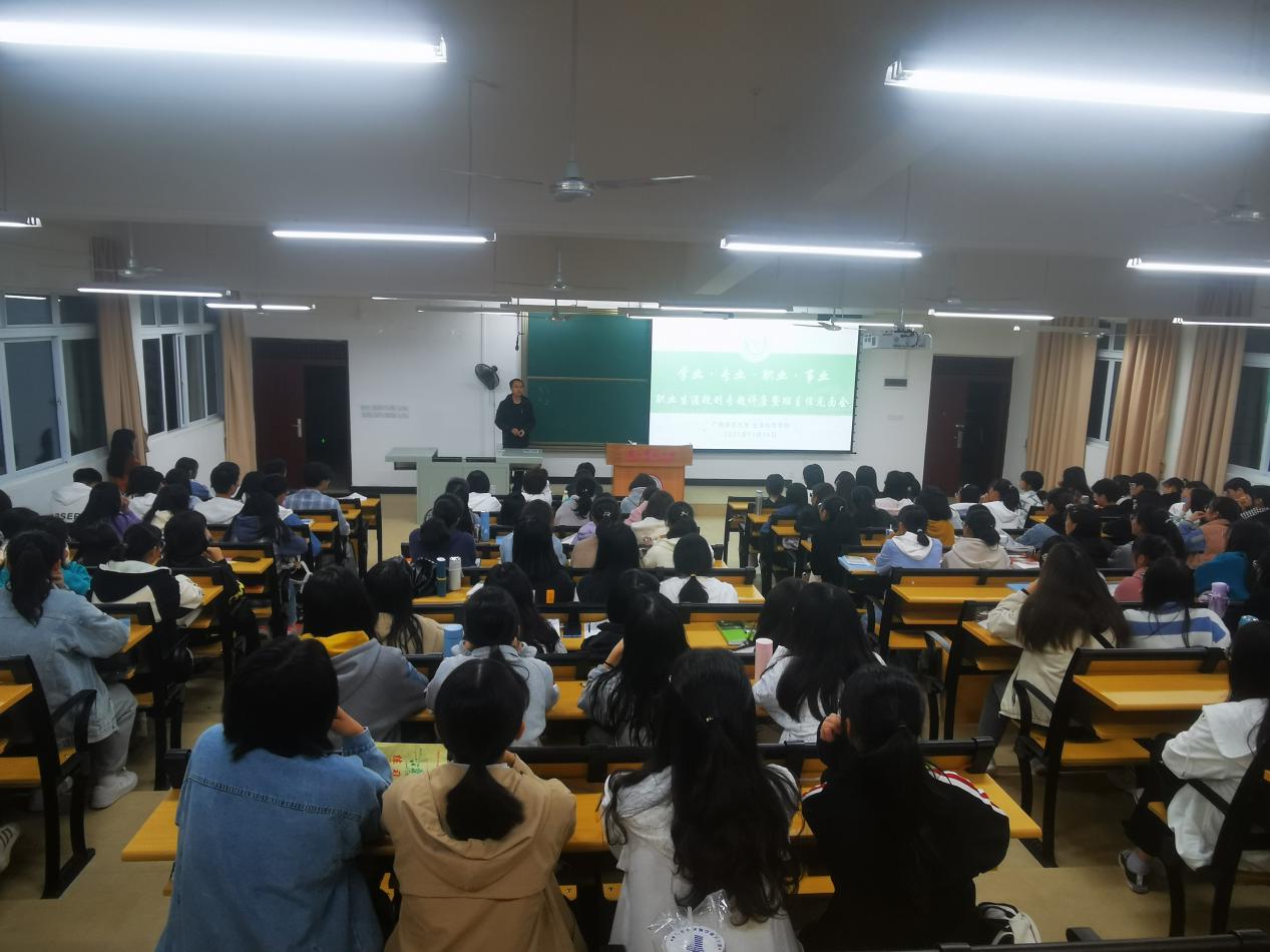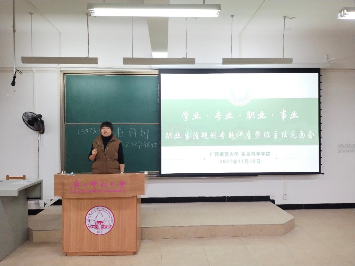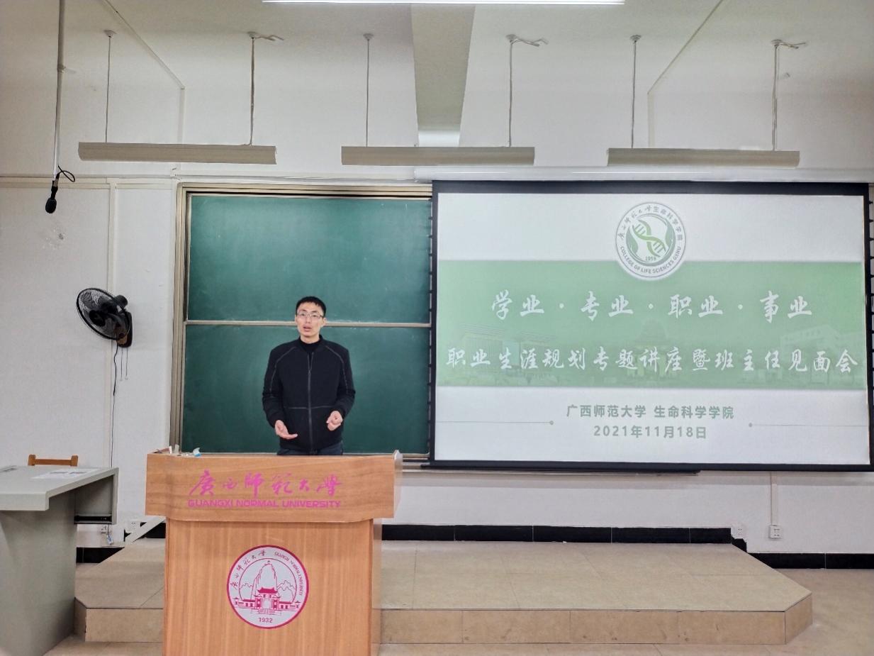 为积极响应学院党委"我为群众办实事""我为青年做件事"实践活动号召,引导同学们正确定大学发展方向,2021年11月18日晚,生命科学学院于理科楼四区202、203教室开展“学业·专业·职业·事业”职业生涯规划专题讲座暨班主任见面会。本次专题讲座由生命科学学院2021级辅导员秦乐主持,特邀2021级各班班主任杜丽娜、余国华、覃云斌、陈泽柠进行主讲,2021级生命科学学院全体同学共同参与。