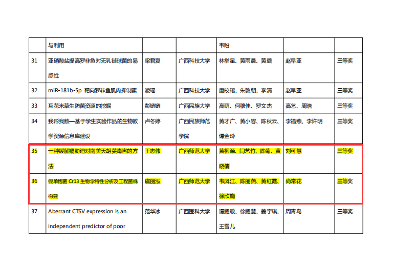 日前,广西本科高校生物科学与生物工程类教学指导委员会公布了第三届广西生物科学与生物工程类大学生创意、创新和创业竞赛评审结果,我院师生在比赛中斩获多项佳绩,其中一等奖2项、二等奖2项目、三等奖2项、优秀指导老师2人。