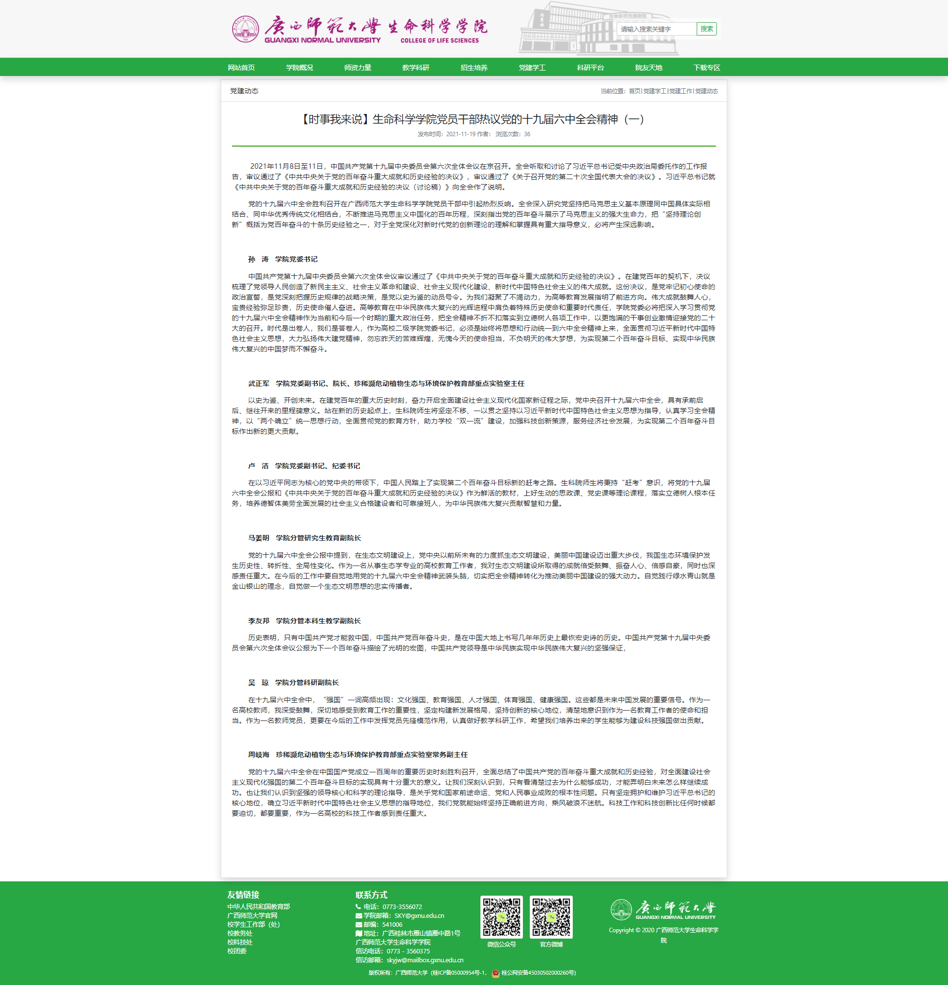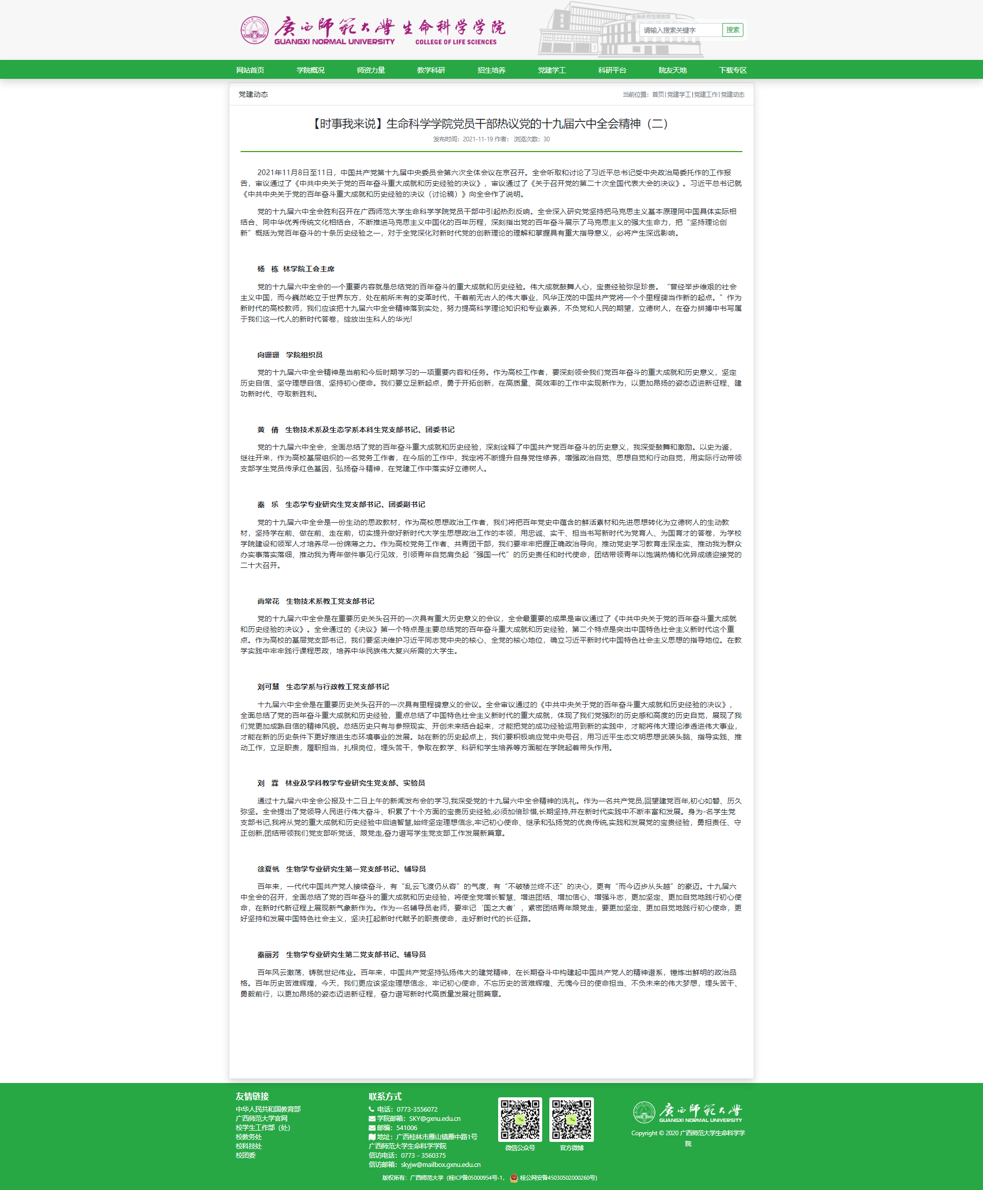 为切实抓好十九届六中全会精神学习贯彻,用全会精神引领学院各项事业高质量发展,广西师范大学生命科学学院党委第一时间启动“党委领学、党团支部研学、党团员互学”三级联动学习方案,组织全院师生在学院迅速掀起学习传达全会精神的热潮。