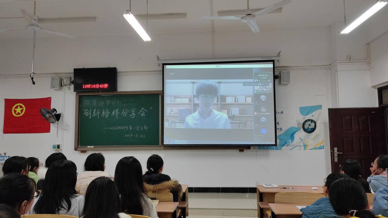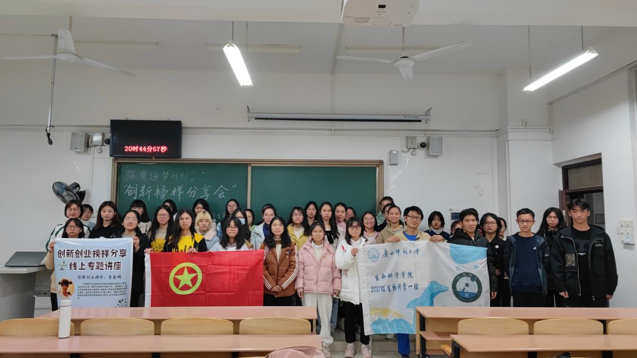 为培养新生“敢闯会创”的创新能力,传承学院优秀创新创业者的优良品质,生命科学学院学生会学习部联合2021级生物科学第一团支部于2021年11月28日晚19点在理科楼理一区401、402、403教室开展创新创业强鹰逐梦计划之“榜样归来”分享会。本次讲座由学院2020届自治区优秀毕业生李春明主讲,2021级生物科学一班团支书黄晓倩主持,学院团委副书记、2021级专职辅导员秦乐老师及2021级全体同学共同参加。