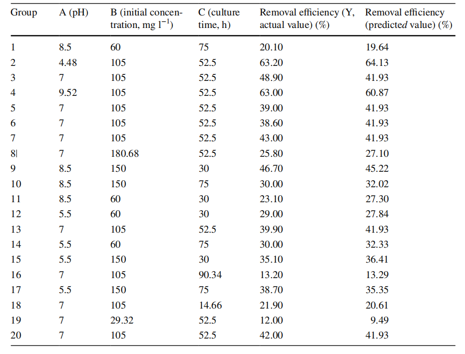 微生物的生长条件可以显著性影响重金属的去除能力。本次研究的目的是提高Cr(VI)的去除能力以及不动杆菌属Cr1的应用水平。(16SrDNA序列GenBank登录号,MN900681)。而本研究主要以pH、Cr(VI) 浓度和培养时间为研究重点,这是影响 Cr(VI)去除的主要因素。通过响应面设计三个变量来优化重金属去除效率。结论:最佳生长条件为:pH为9.52,Cr(VI) 浓度为128.55mg l −1,培养时间为43.30 h,预测和实际最大值分别为65.13%和67.26%。因此,该研究表明该菌株为不动杆菌属Cr1在Cr(VI)的生物修复方面具有很好的潜力。