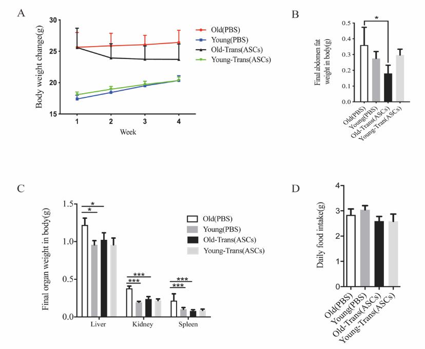 方法:测定移植幼鼠(2个月)ASCs的老龄(22个月)C57BL/6J小鼠体重变化以及生化、细胞因子、激素分泌、细胞衰老、脂质代谢和ASCs功能变化。
