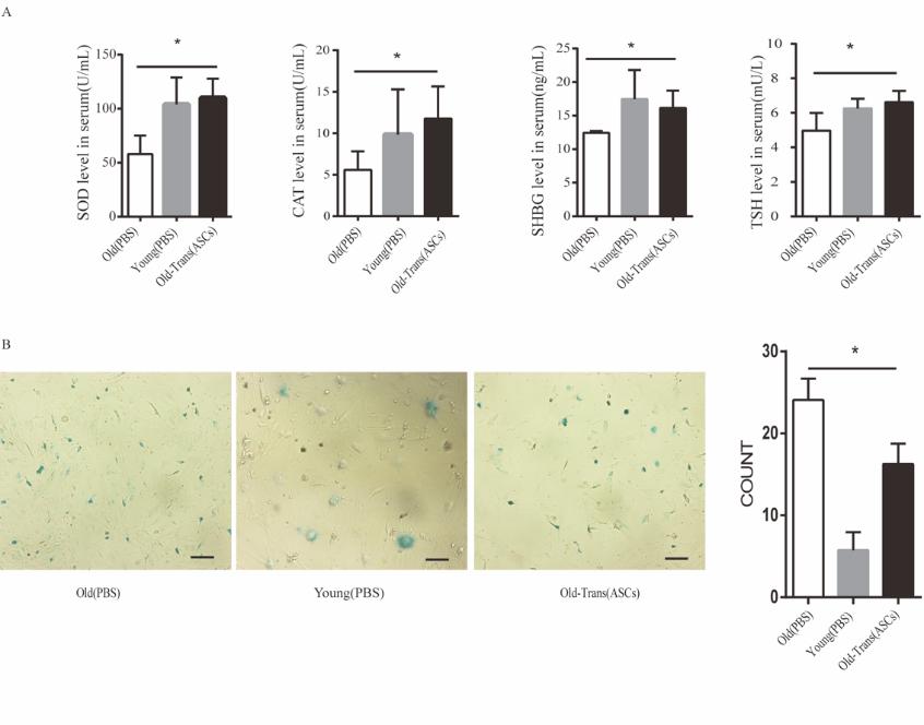 结果:结果表明,ASCs治疗的老年小鼠具有抗衰老和抗肥胖作用,如体重和器官重量显着减少,干细胞可塑性改善,抗氧化能力增强(超氧化物歧化酶和过氧化氢酶),肝肾功能改善,脂质代谢改善,并增加激素分泌(性激素结合球蛋白,促甲状腺激素和瘦素)。用ASCs治疗减少细胞衰老并抑制炎性因子(白细胞介素-6和肿瘤坏死因子α)的分泌。