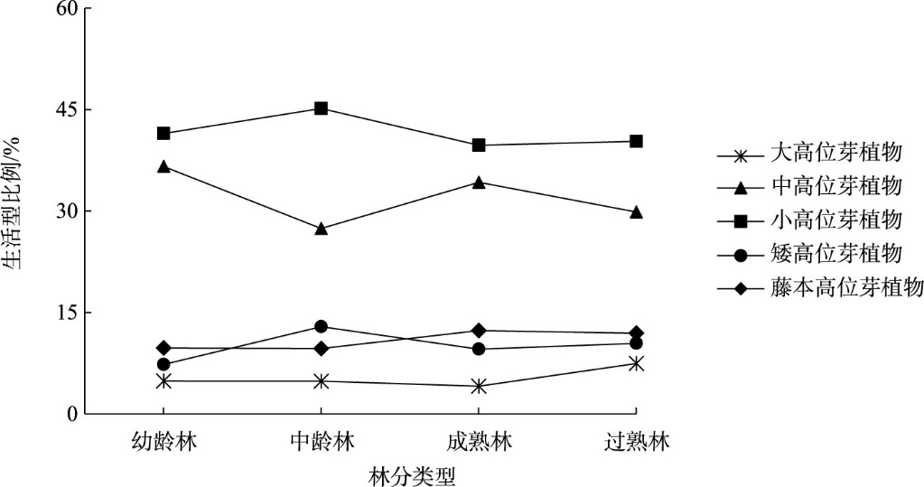 图1 不同林龄马尾松人工林林下木本植物生活型谱