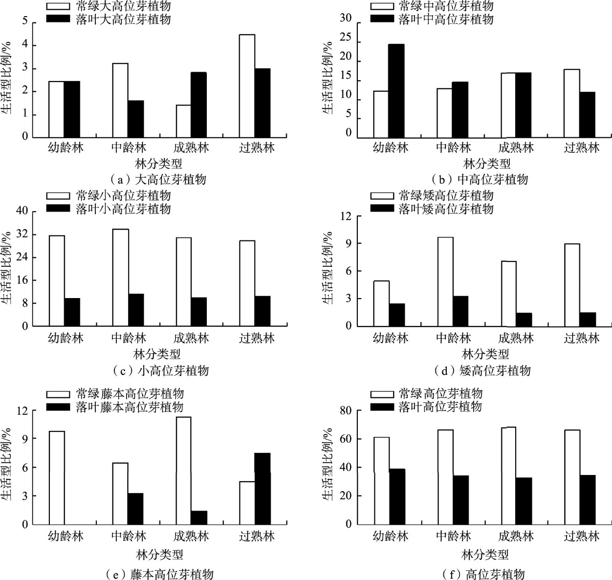图2 不同林龄马尾松人工林林下常绿与落叶高位芽植物生活型谱