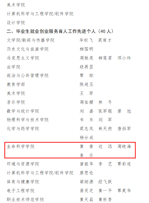 生命科学学院被评为广西师范大学2021年毕业生就业创业服务育人工作“突出贡献单位”;学院“秦乐、黄倩、边迅、周岐海”四位老师被评为广西师范大学2021年毕业生就业创业服务育人工作先进个人。