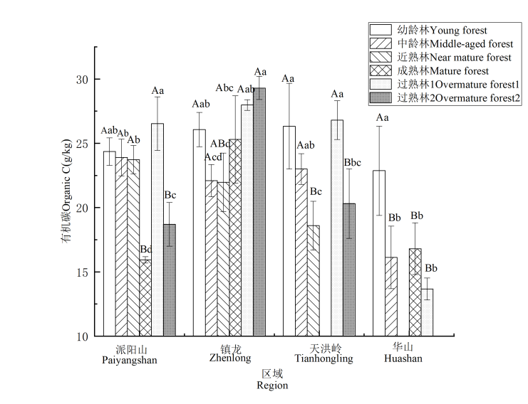 2.土壤有机C、全N含量在成熟林阶段最低,且呈波动性变化,均在成熟林阶段最小,有机C含量在幼龄林阶段最大,全N含量在近熟林阶段最大。土壤全P含量在中龄林阶段最低,且随林龄增加呈先减少后增加趋势。