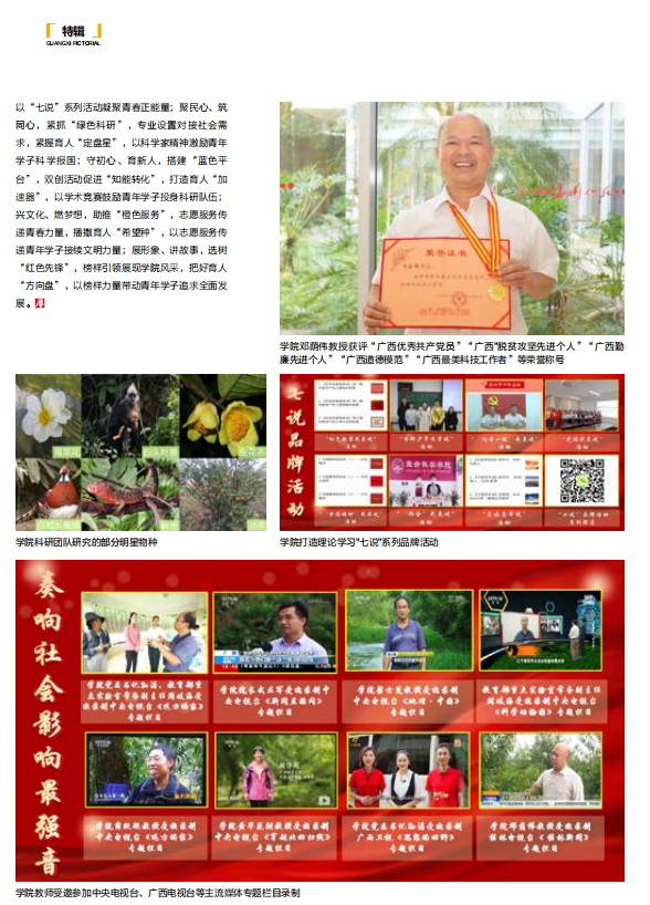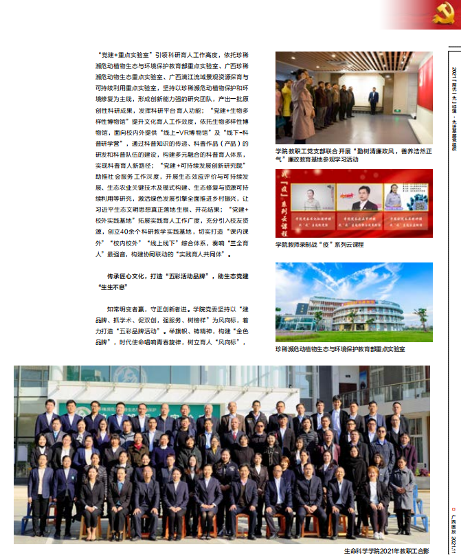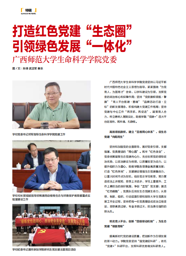 近日,《广西画报》百年风华党旗红特刊以《打造红色党建“生态圈” 引领绿色发展“一体化”》为题,报道我校生命科学学院党建工作坚持紧紧围绕“红色党建”引领“绿色发展”的党建思路、积极构建大党建工作格局的经验做法。