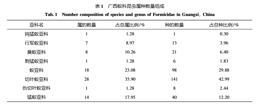 (1)结果统计表明,广西蚁科昆虫共记载8亚科78属328种及亚种,其中广西特有种26个。