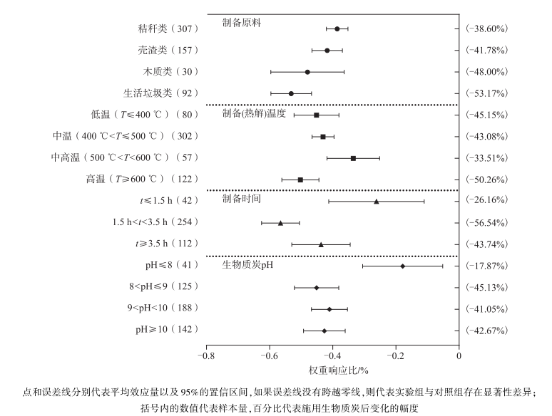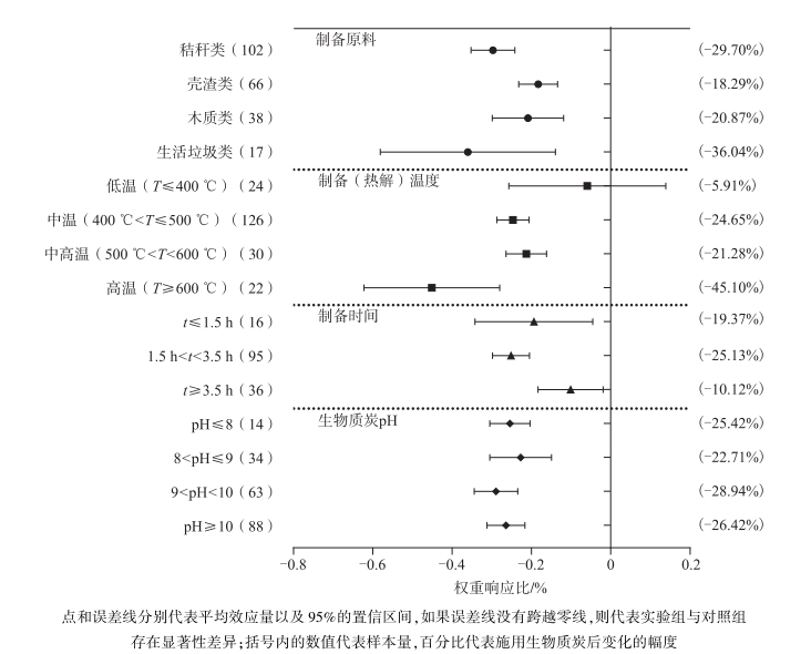 (3)生物质炭合适的制备原料、热解温度、制备时间及施用量分别为生活垃圾类物质、大于等于600℃、大于等于3.5 h和3%左右,此时对土壤有效态镉的降幅分别为36.04%、45.10%、25.13%、35.68%;相应的,植物体镉吸收的降幅分别为53.17%、50.26%、56.54%、45.75%。生物质炭pH>8时,对土壤有效态镉含量及植物体镉吸收影响的差别均不大,但植物的响应比土壤更明显,平均降幅为土壤的1.73倍。
