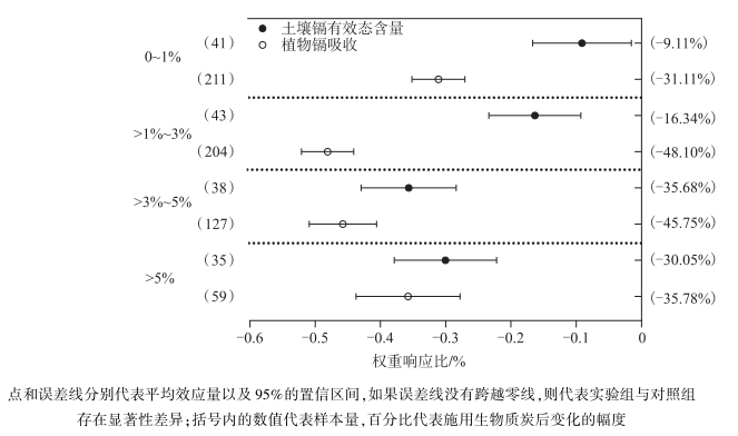 (2)从土壤质地来说,生物质炭对壤质土壤降幅最大,达33.06%;从土壤酸碱性来说,生物质炭对弱酸性(5.5<pH≤6.5)土壤的有效态镉降幅最大,达36.72%。