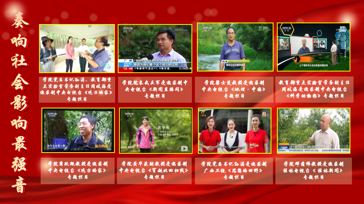 学院搭建学术、科研、科普一体化交流平台。生物多样性博物馆接待来自国内外专家学者考察访问和交流,参观人数累计约4万人次;学院专家学者数次受邀参加中央电视台、广西电视台、乡村振兴专题节目录制。依托立体育人模式,助推讲述师大好故事,所参与的科研、科普活动受到《新华社》《新华网》《央视网》《中国文明网》等媒体50余次报道,为提升学校学院美誉度、扩大学校学院影响力作出特别贡献。