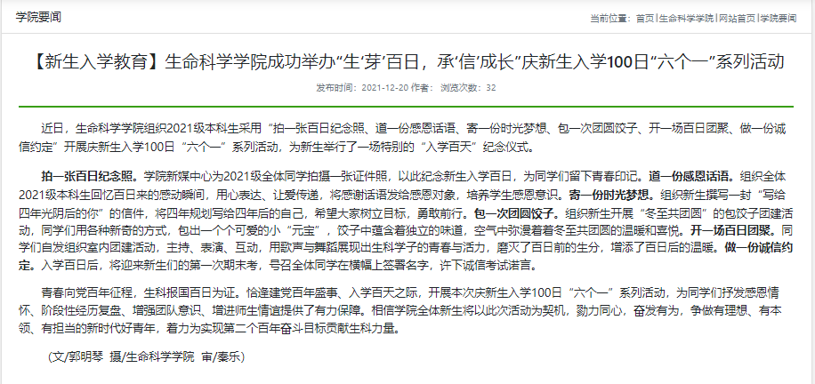 根据《广西师范大学关于做好2021级新生入学工作的通知》《广西师范大学2021级本科生入学教育工作方案》文件精神,结合学院实际,制定《广西师范大学生命科学学院2021级本科新生入学教育方案》,经过精心的安排筹划和扎实的组织实施,生命科学学院2021级新生入学教育工作已圆满结束,并取得了良好的效果。现将我院2021级新生入学教育工作总结如下: