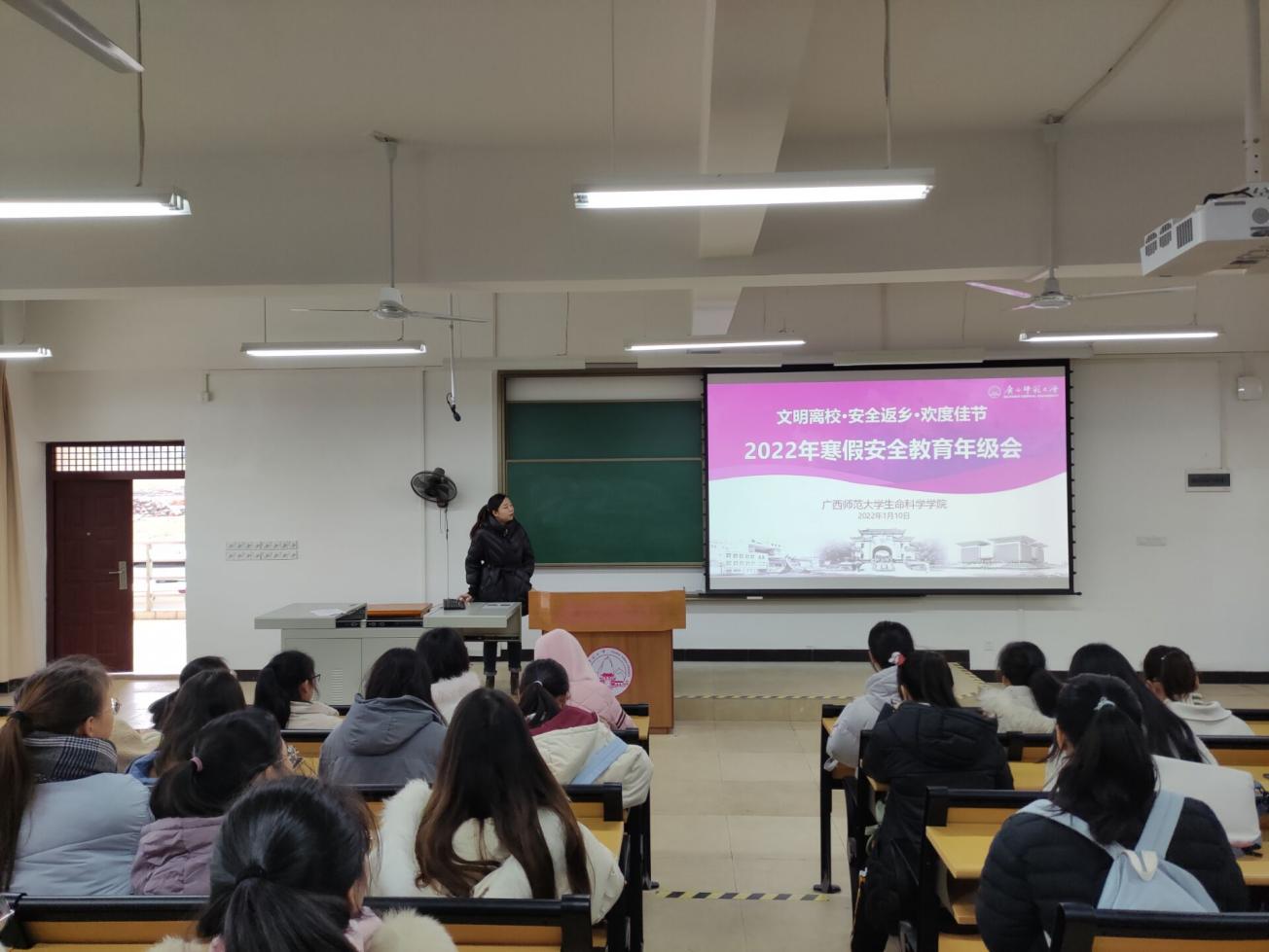 进一步落实学校关于寒假期间学生安全管理工作,提高学生返乡安全意识,2022110日上午,生命科学学院2021级于理科楼四区101102教室开展“文明离校·安全返乡·欢度佳节”2022年寒假安全教育主题年级会大会由2021级专职辅导员秦乐、兼职辅导员郭明琴主持,全体2021级本科生共同参与