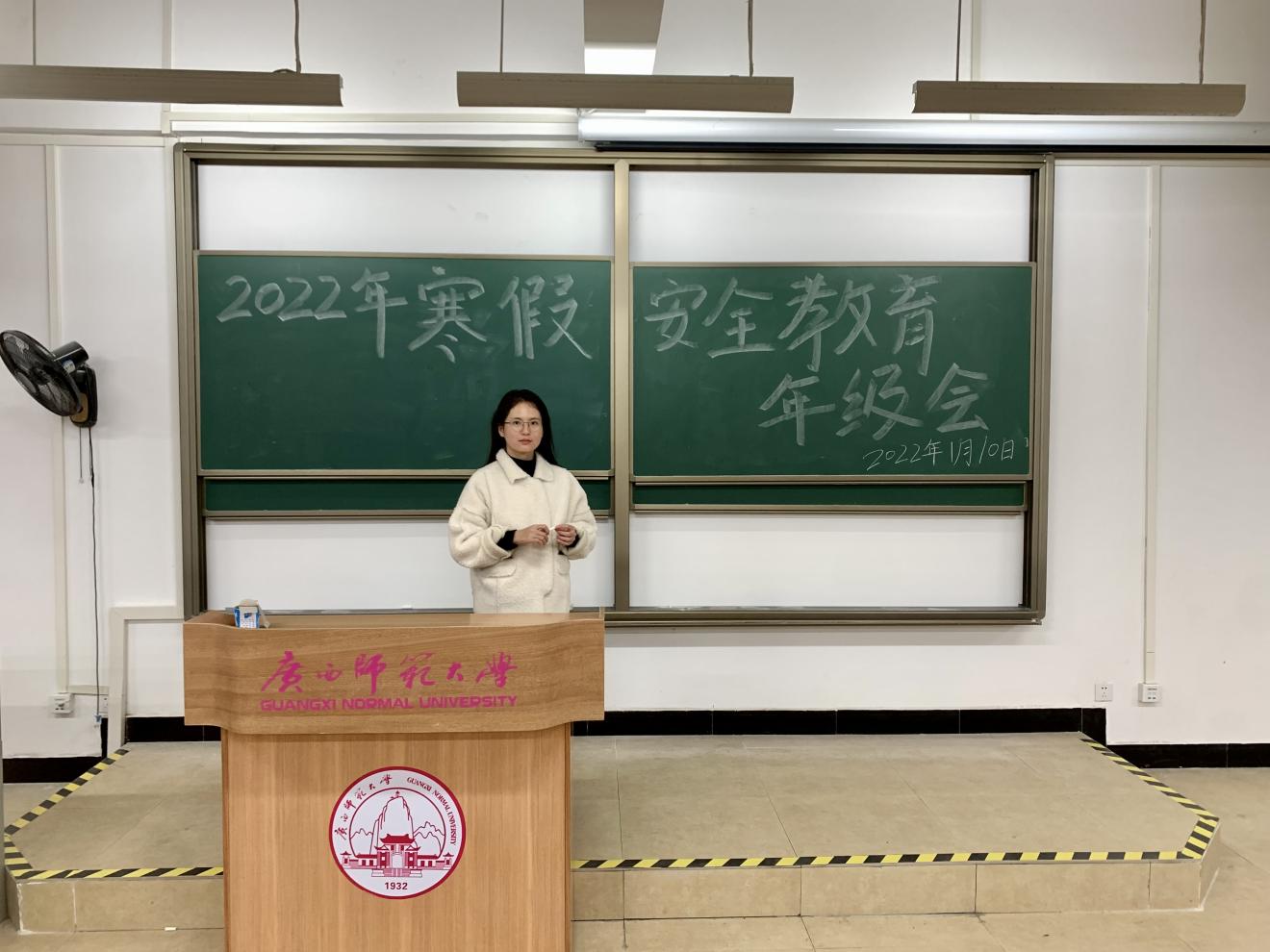 为进一步落实学校关于寒假期间学生安全管理工作,提高学生返乡安全意识,2022年1月10日上午,生命科学学院2021级于理科楼四区101、102教室开展“文明离校·安全返乡·欢度佳节”2022年寒假安全教育主题年级会,大会由2021级专职辅导员秦乐、兼职辅导员郭明琴主持,全体2021级本科生共同参与。
