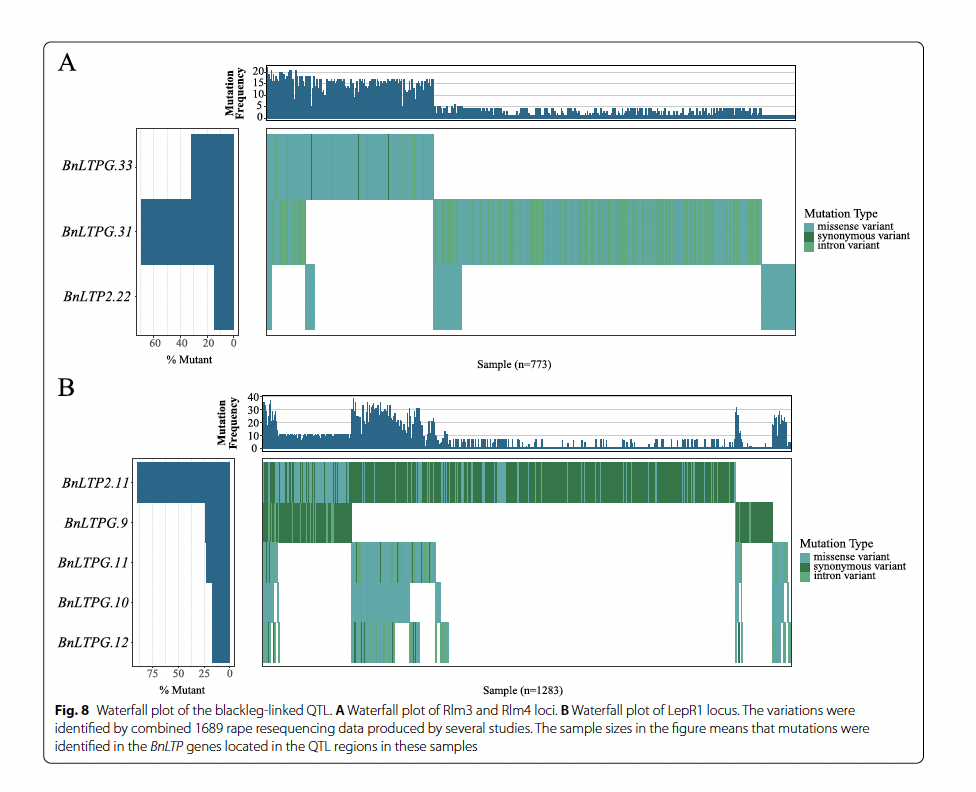 非特异性脂质转移蛋白(nsLTPs)是一种小而基本的蛋白质,参与细胞凋亡一些生物或非生物应激反应。甘蓝型油菜易受多种真菌病害的影响。鉴定甘蓝型油菜中的BnLTP及其在植物病害反应中的表达非常重要。因为个体之间存在基因存在/缺失差异,甘蓝型油菜的参考基因组并不包含所有甘蓝型油菜基因,因此,在甘蓝型油菜泛基因组水平中挖掘候选BnLTP基因具有重要意义。在本研究中,在甘蓝型油菜的泛基因组水平中共鉴定到246个BnLTP基因,可分为1、2、C、D和G五类, 并且BnLTP基因在不同品种间存在差异。此外,对Bn其分类、系统发育重建、染色体分布、功能注释和基因表达进行了分析。进一步研究发现所有BnLTP基因的2 kb上游区域存在对生物和非生物胁迫做出反应的潜在顺式元件。根据RNA测序分析表明,BnLTP基因参与了对菌核病的应答,并鉴定到了32个与黑胫病抗性数量性状位点(QTL)连锁的BnLTP。