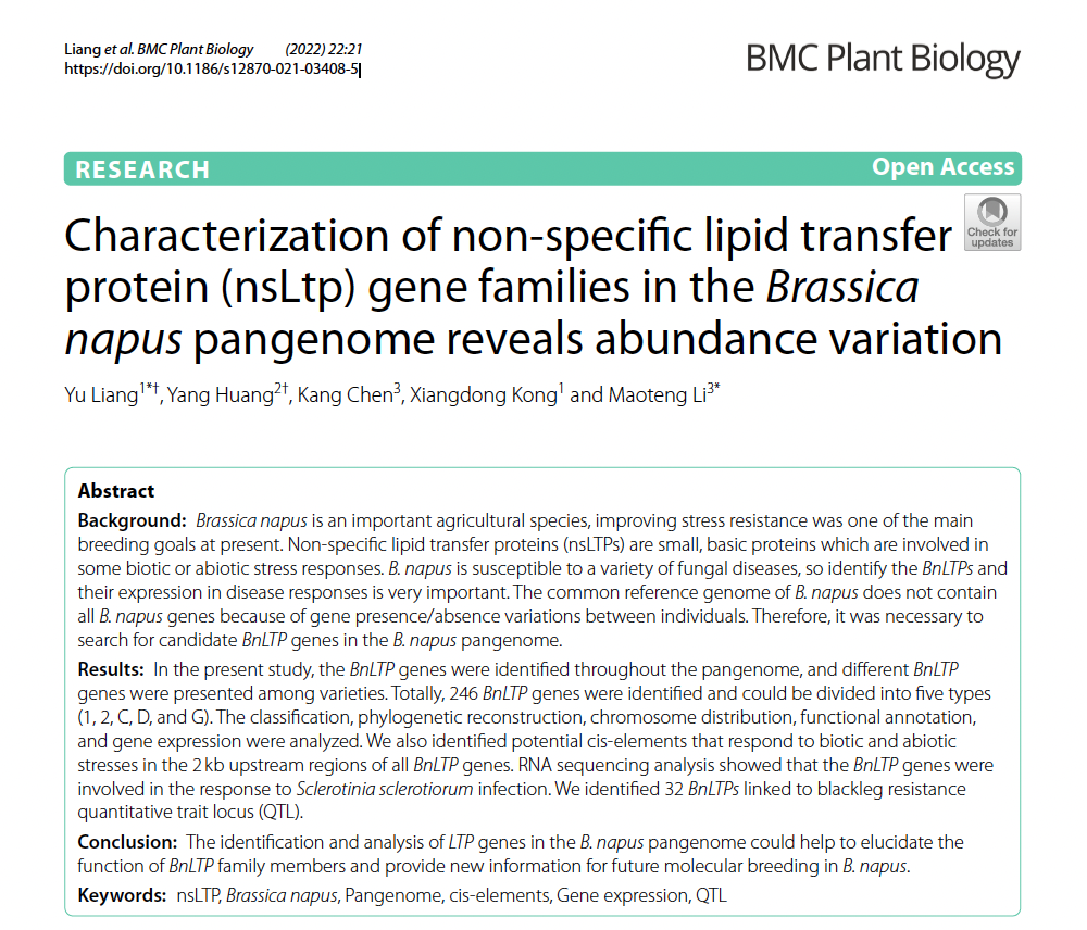 近日,生科院青年教师梁语博士在国际学术期刊BMC plant biology在线发表了题为“Characterization of non-specific lipid transfer protein (nsLtp) gene families in the Brassica napus pangenome reveals abundance variation”的研究论文。该研究揭示了脂质转运蛋白家族在甘蓝型油菜泛基因组水平中的丰度变异和结构特点。我校为该论文的第一单位,我院青年教师梁语博士为第一作者和通讯作者,华中科技大学栗茂腾教授为共同通讯作者。