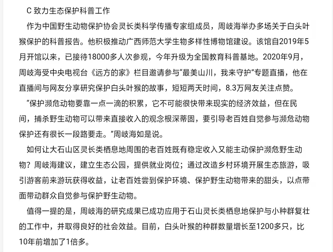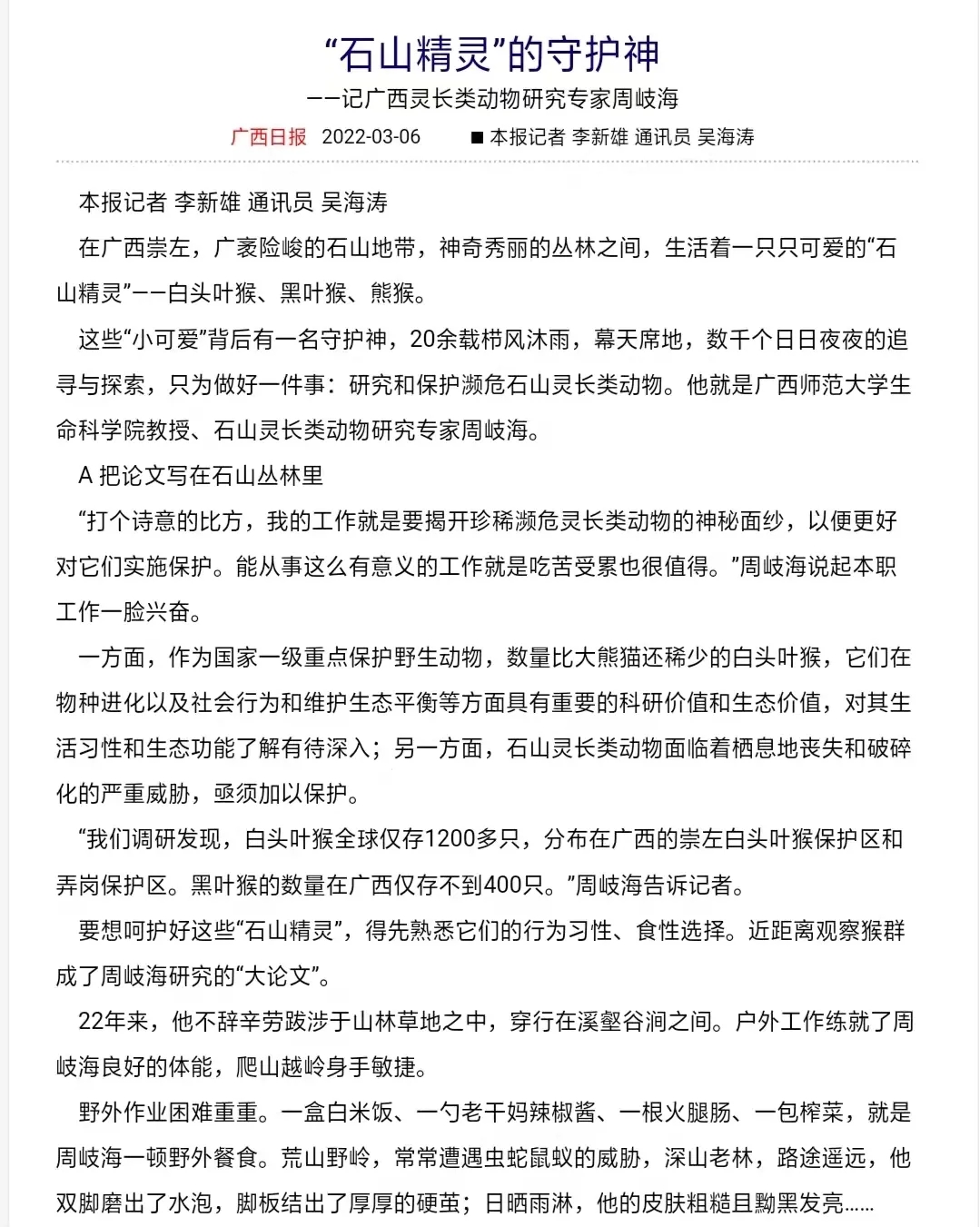 近日,《广西日报》以《“石山精灵”的守护者--记广西灵长类动物研究专家周岐海》为题刊登我校生命科学学院周岐海教授事迹。