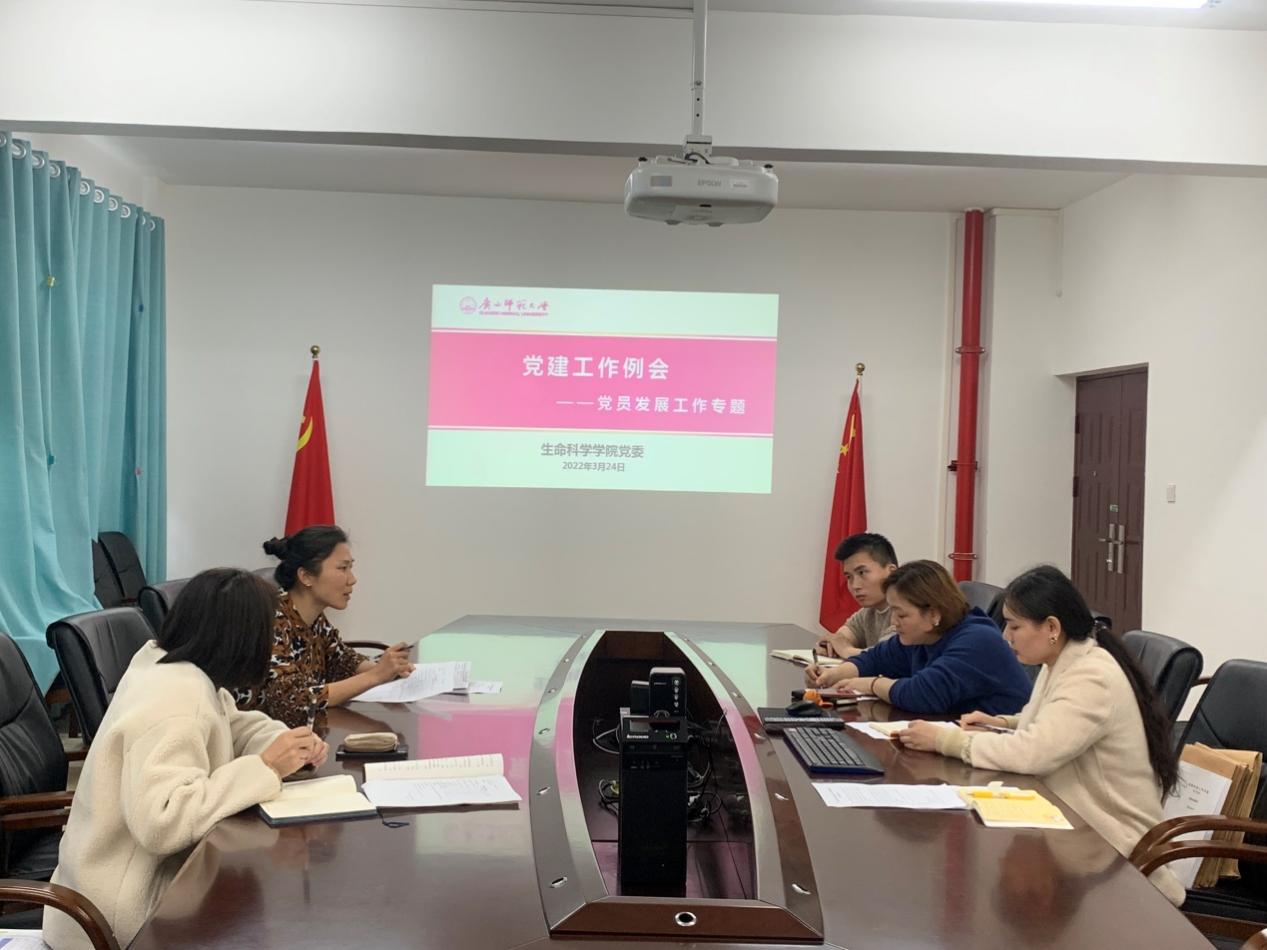 为进一步贯彻落实《中国共产党发展党员工作细则》《中国共产党党员教育管理工作条例》《中国共产党普通高等学校基层组织工作条例》《中国共产党支部工作条例(试行)》等有关规定,进一步从严管理党员档案、规范党员发展工作,3月24日,生命科学学院党委在党员之家召开了党建工作会议,会议针对党员发展、党员管理、党员档案、党支部标准化规范化建设等开展了专题研究和深入交流。学院党委书记孙涛、党委副书记卢洁、党支部书记、专职组织员、全体辅导员参加此次会议。