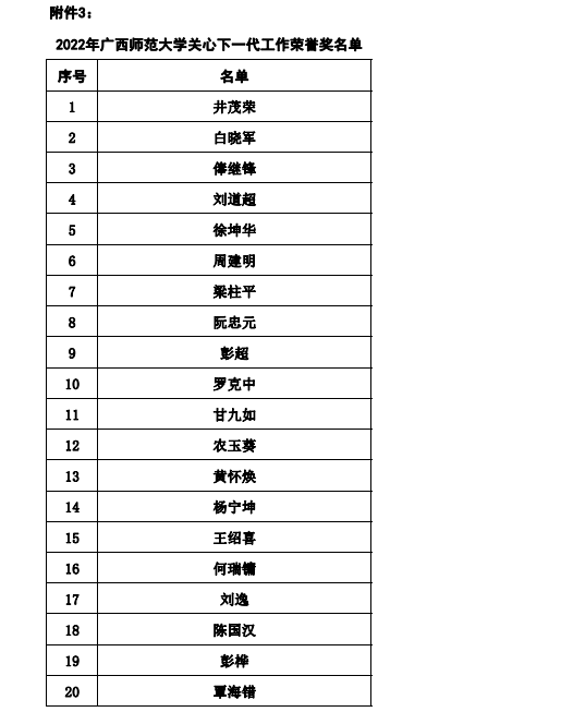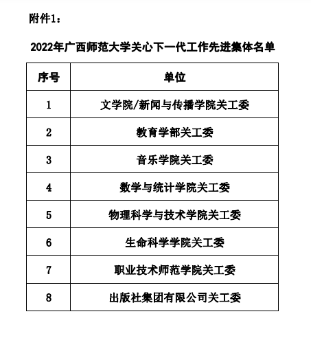 为加强校园文化建设,表彰学校在关心下一代工作的突出成果,广西师范大学根据《关于组织开展我校2022年关心下一代工作先进集体和先进个人评选工作的通知》,经过各学院(部)、各单位(含附属单位)关工委推荐、审核、校评审委员评审,确定生命科学学院关工委为“关心下一代工作先进集体”;周善义、黄倩为“关心下一代工作先进工作者”;甘九如获“关心下一代工作荣誉奖”。