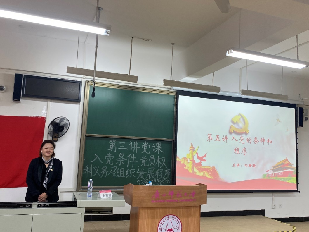 【第三讲】2022年4月16日14:30,广西师范大学生命科学学院党委委员向珊珊带领大家学习第四讲《入党的条件和程序》。课堂开始,向珊珊老师提出问题,让同学们思考入党积极分子如何走好发展党员之路?紧接着,向珊珊老师结合生动的案例和详细的解读,为同学们讲述了从团员到积极分子到党员的发展之路,使同学们坚定入党动机,明确入党流程。