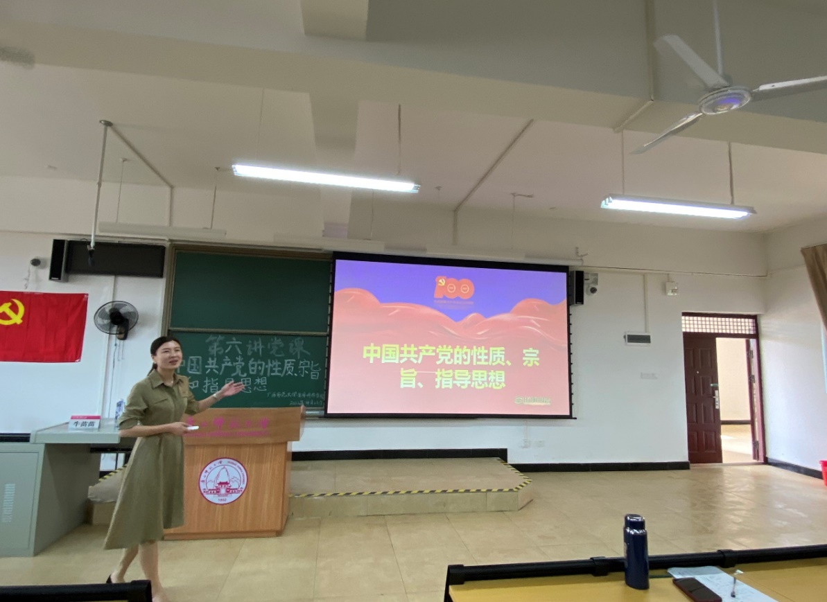【第六讲】2022年4月23日15:40,广西师范大学历史文化与旅游学院专职辅导员牛苗苗带领大家学习第六讲《中国共产党的性质、宗旨和指导思想》。课堂开始,牛苗苗老师带领同学们回顾了中国共产党的历史,引导同学们在历史的长流中进行学习。在讲授过程中,牛苗苗老师幽默风趣地结合现实事例与自身经历为同学们讲述了中国共产党的性质、宗旨和指导思想。最后,她向同学们提出了四点要求:第一,认真学习,实践党章;第二,树立正确的价值观;第三,实践党的宗旨要从小事做起;第四,要经得起长期严峻的考验。