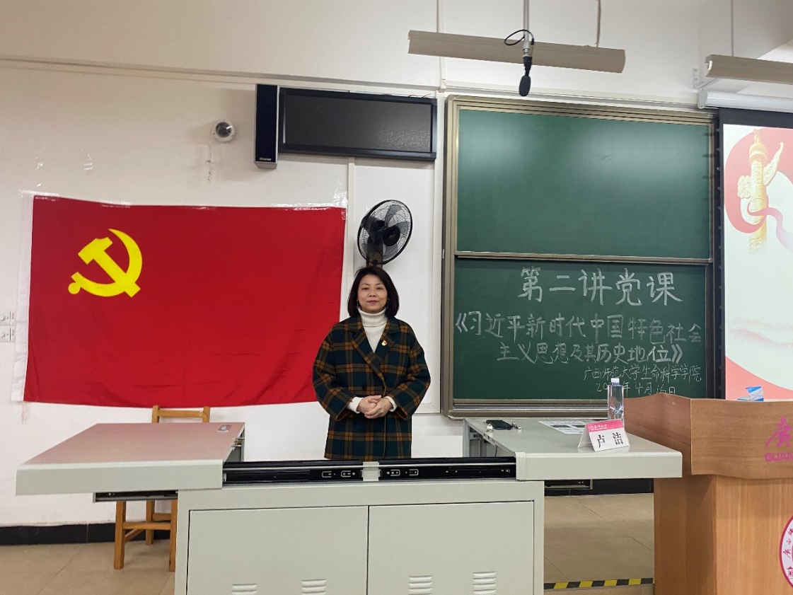 【第二讲】2022年4月16日11:00,广西师范大学生命科学学院党委副书记、纪委书记卢洁带领大家学习第二讲《习近平新时代中国特色社会主义思想及其历史地位》。课堂开始,卢洁老师用习近平总书记的生平经历展开讲述,紧接着,卢洁老师结合视频讲述了百年党史和历史变革。随后,她向同学们详细介绍了习近平新时代中国特色社会主义思想及其历史地位,让同学们更好地理解这一党的行动指南。