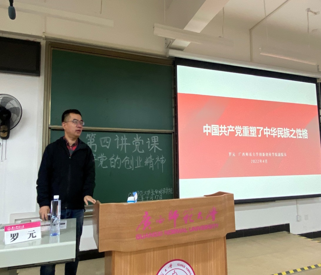 【第四讲】2022年4月17日9:00,广西师范大学创新创业学院副院长罗元带领大家学习第四讲《中国共产党重塑了中华民族之性格》。罗元老师以人生的价值在于对社会有所创造和有所奉献这一观点引出主题。紧接着,罗元老师讲述了中国共产党筚路蓝缕奠基立业的百年成就,并结合历史阐述了中国共产党是如何重塑了中华民族的性格,让同学深刻感受到了中国共产党的伟大。