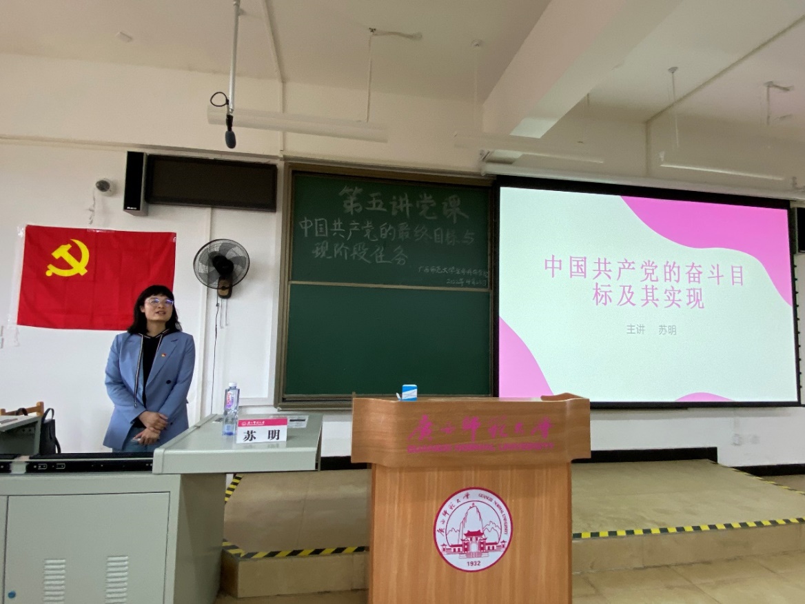 【第五讲】2022年4月23日14:00,广西师范大学经济管理学院党委副书记、纪委书记苏明带领大家学习第五讲《中国共产党的奋斗目标及其实现》。苏明老师首先为同学们讲述了中国共产党从小到大,由弱到强,从一叶扁舟到巍巍巨轮的历史。紧接着,苏明老师要求同学们带着“为什么要加入中国共产党?怎样才能加入中国共产党?加入中国共产党以后干什么?”这三个问题进行学习。随后,苏老师结合视频让同学们进一步理解共产主义的理想性和现实性,同时指出资本主义的不足。最后,苏明老师强调,资本主义必然灭亡,社会主义必然胜利,共产主义的最终目标一定能实现!