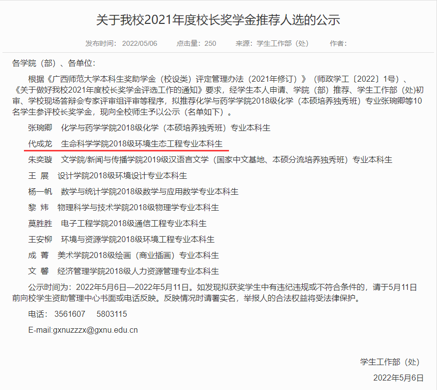 近日,广西师范大学学生工作部(处)公示了我校2021年度校长奖学金推荐人选名单(公示时间2022年5月6日—5月11日)。根据《广西师范大学本科生奖助学金(校设类)评定管理办法(2021年修订)》(师政学工〔2022〕1号)、《关于做好我校2021年度校长奖学金评选工作的通知》要求,经学生本人申请、学院(部)推荐、学生工作部(处)初审、学校现场答辩会专家评审组评审等程序,评选出2021年度校长奖学金拟推荐人选10名。我院2018级环境生态工程专业本科生代成龙同学成功入围并荣获2021年度校长奖学金。