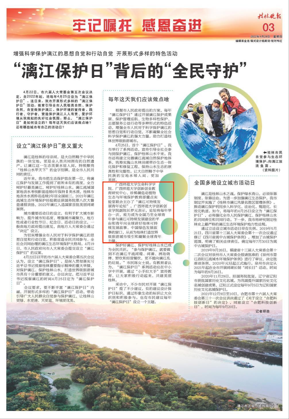 4月28日,桂林晚报、桂林生活网关注报道我校珍稀濒危动植物生态与环境保护教育部重点实验室、生命科学学院、创新创业教育研究中心联合举办漓江可持续发展青年论坛。聆听科学前沿、启迪创新思维、感受青年的科学热情,这次漓江可持续发展青年论坛有力推动了漓江可持续发展的交流与碰撞,为漓江保护与发展发出师大青年之声,贡献师大青年方案。