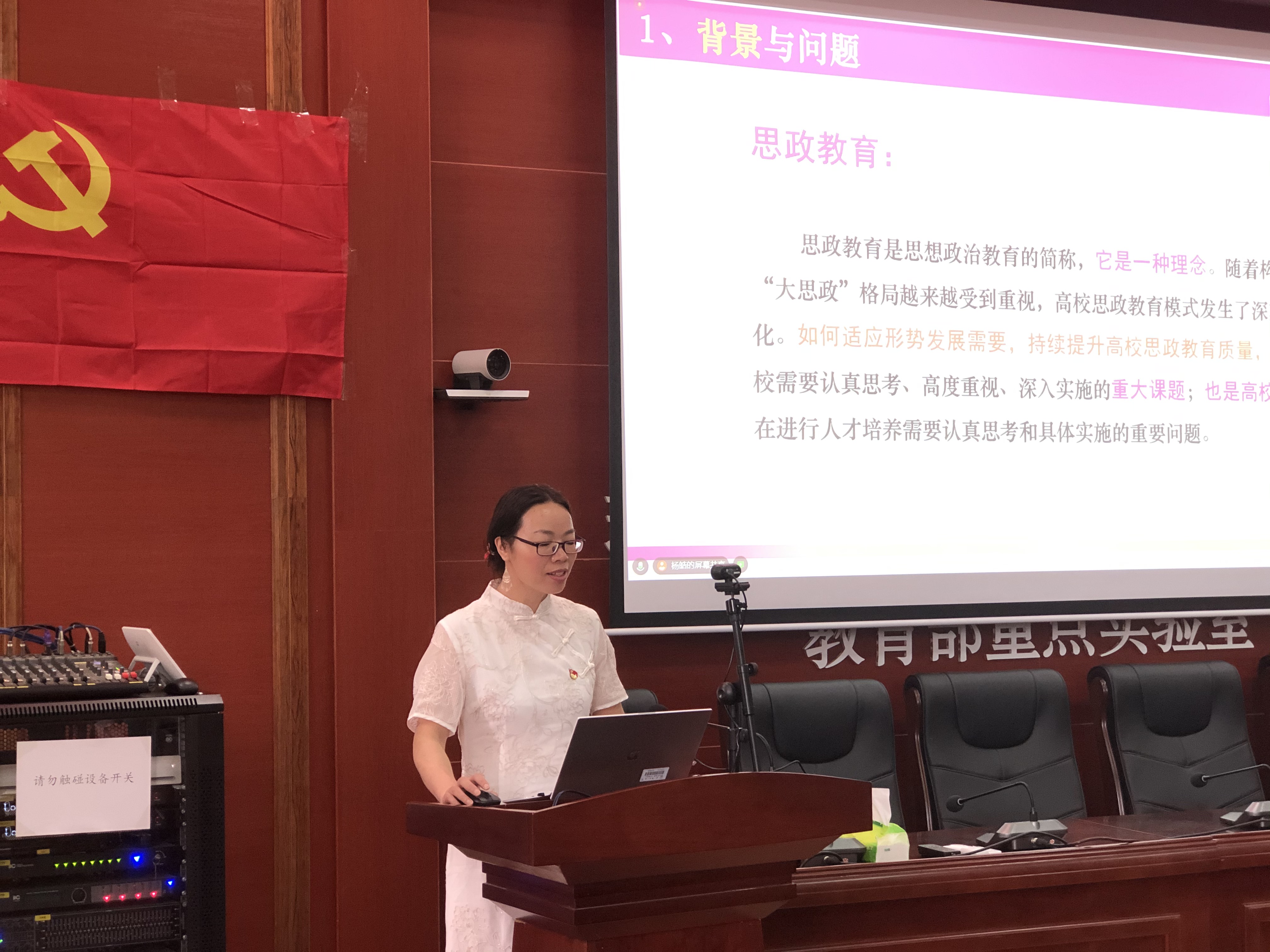首先,刘可慧老师通过详细讲解课程思政对于落实立德树人根本任务的重要性,明晰了课程思政的内涵、建设理念和融入路径等相关问题。她指出,课程思政建设与育人质量提升的内在目标一致,其需以思政教育为统领,通过教育教学、科学研究、创新创业进行融合渗透支撑,达到全方位培养人才的目标,注重培养学生的人文精神、家国情怀、科学规范、学术道德。