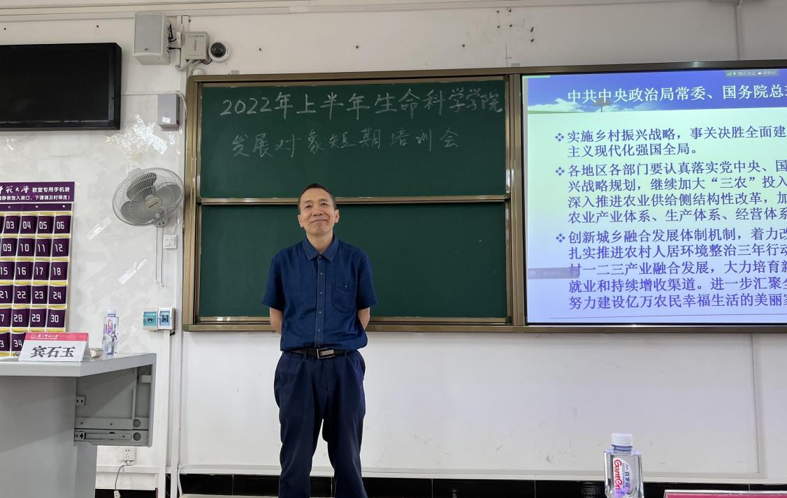 为深入学习贯彻习近平新时代中国特色社会主义思想,促进农村现代化建设,近日,生命科学学院邀请宾石玉教授在理科楼一区202教室做《乡村振兴的发展战略》专题培训。学院党委副书记卢洁、兼职辅导员董静怡以及2022年上半年发展对象参加了此次培训。