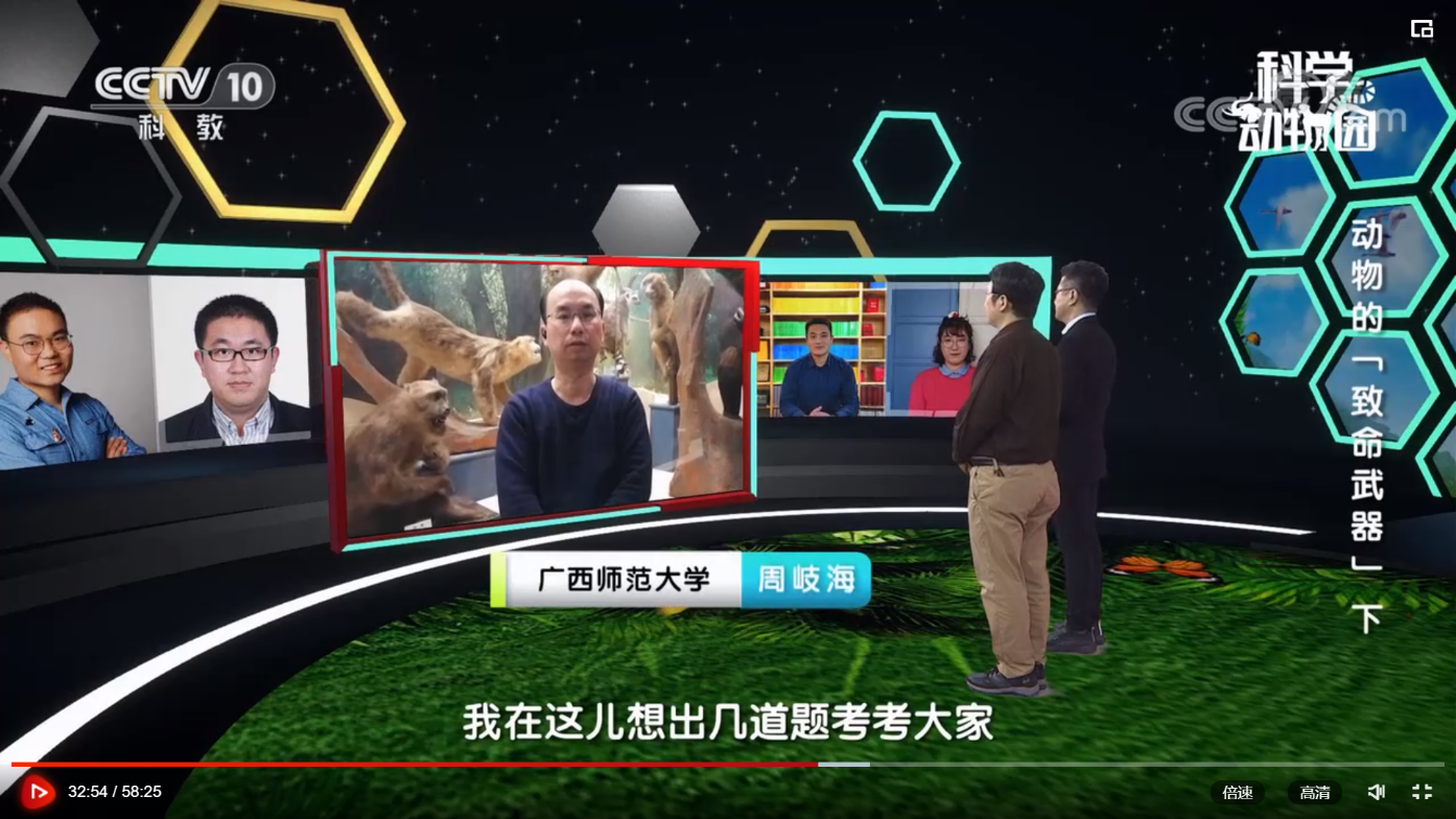 2022年5月28日,中央电视台科教频道《科学动物园》栏目播出科普节目《动物的致命武器》,我室副主任周岐海教授再次作为特邀嘉宾,以我室生物多样性博物馆展厅作为背景录制节目。