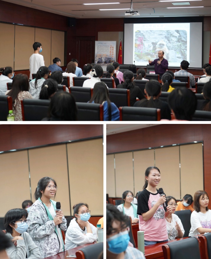 周老师首先从全球最濒危的灵长类动物之一,我国特有种,国家一级保护野生动物——白头叶猴说起,详细介绍了白头叶猴的种群分布、生活环境及其现状与前景,出生物多样性保护对人类社会发展的重要性,强调人类必须重视物种及其栖息地生态的保护。接着,周老师从国家层面,介绍了全国人大常委会委员通过立法全面禁食野生动物,然后结合自己20余年保护白头叶猴的科研实践及生态保护工作经验,呼吁新一代青年要关爱大自然,增强保护生物多样性、保护生态环境的担当与责任意识,为人类的生态文明建设积极贡献力量。在随后的互动交流环节,同学们纷纷踊跃提问,与嘉宾老师进行了热烈互动。
