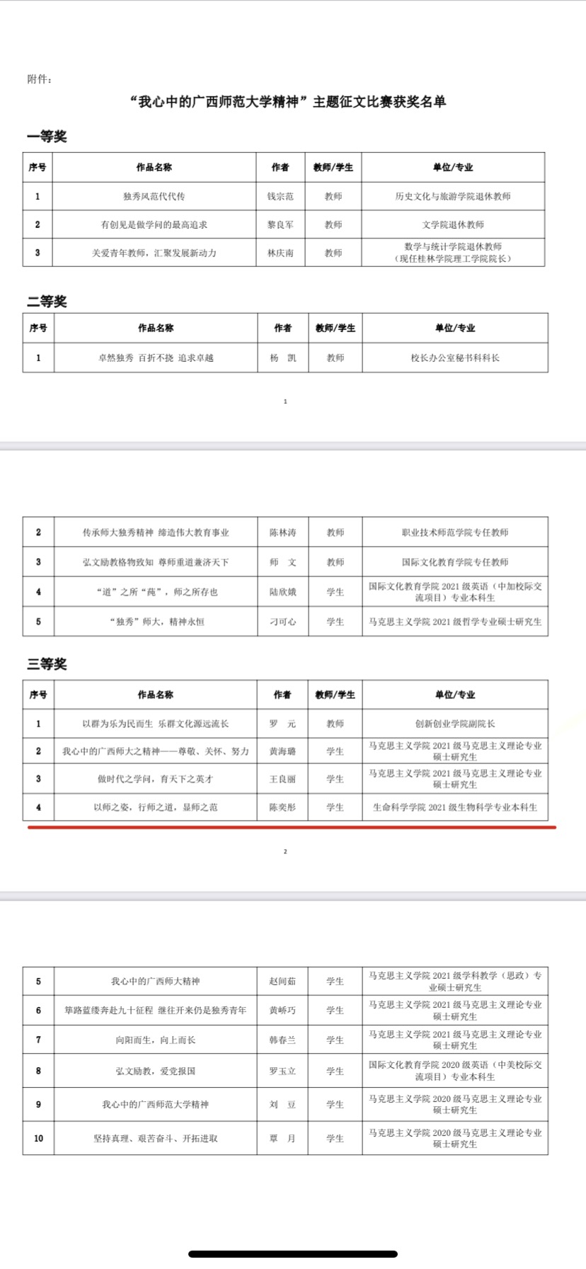 我院2021级生物科学专业5班陈奕彤的作品荣获此次比赛三等奖。陈奕彤同学以《以师之姿,行师之道,显师之范》为题,将师大的精神与古汉语文学结合,从不同角度阐述了师之姿、师之道以及师之范,充分展现了她心目中的广西师范大学精神。
