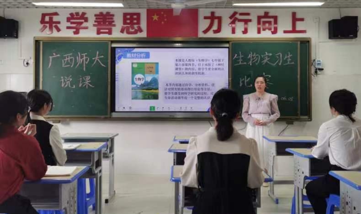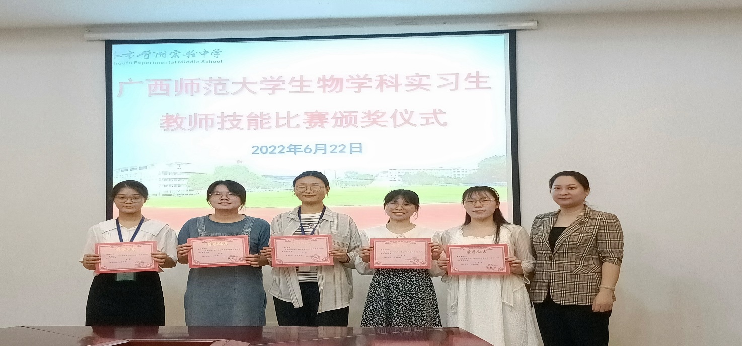 为提高实习教师的教学技能和培训质量、提高实习教师业务素质及教学水平,桂林市首附实验中学初中生物组于2022年六月份在书香苑成功举办“广西师范大学生物学科实习生教师技能比赛”活动。活动分为三个部分:实习生说课比赛、实习生优质赛比赛、评课及颁奖环节。此次比赛由广西师范大学初中生物学科实习生参与,桂林市首附实验中学张滢老师、罗伶俐老师、杨艳英老师出席本次活动。