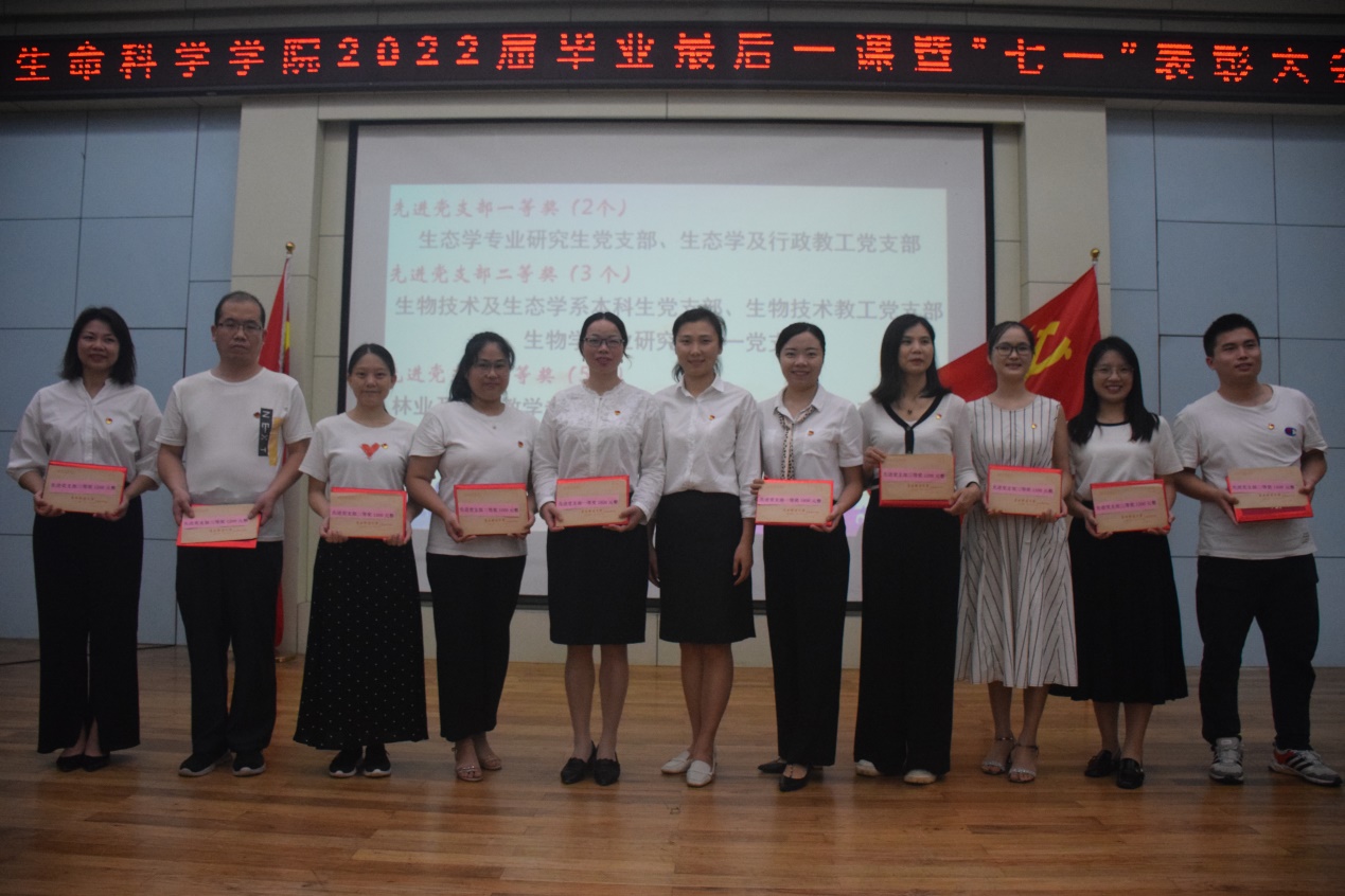 2022年6月23日上午9:30,生命科学学院在雁山校区文科楼219报告厅举行了2022届毕业最后一课暨“七一”表彰大会。本次活动由党委副书记卢洁主持,学院党委委员、学位委员会委员、“七一”表彰代表、全体专兼职辅导员、2022届本硕毕业生共同出席本次活动。